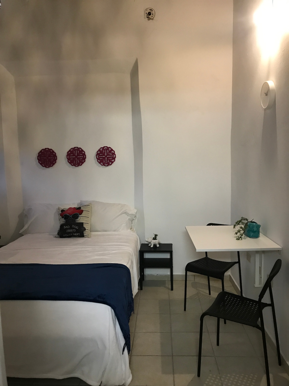 This private room located in the third floor of the building offers a more private and quiet setting. It has a window, a small table with two chairs, a good size en suite bathroom and were to put your clothes.