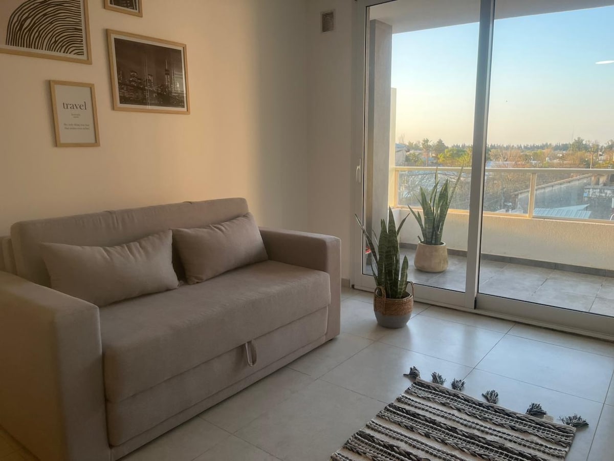 Relajate en este alojamiento único y tranquilo. Departamento apto para 3 personas, cochera techada , cocina comedor con sillón cama , dormitorio cama 2 plazas , completamente amoblado, TV 50”, wifi, pava eléctrica, heladera, aire acondicionado grande , horno eléctrico, etc A pasos del centro de la ciudad
