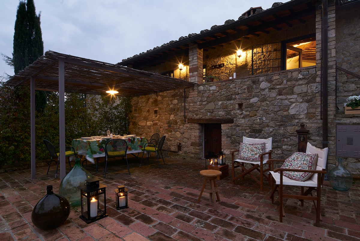 Podere Vergianoni è un antica e autentica casa colonica risalente al 1600 situata nelle splendide colline del Chianti in Toscana . L'appartamento è arredato in perfetto stile tradizionale locale dell'antica Toscana : antiche travi in legno, pavimenti in cotto e arredamenti unici. Nel grande cortile esterno troverete a vostra disposizione una grande piscina con terrazza panoramica che si affaccia su una valle con vista mozzafiato su vigneti e oliveti dove godersi tramonti spettacolari.
