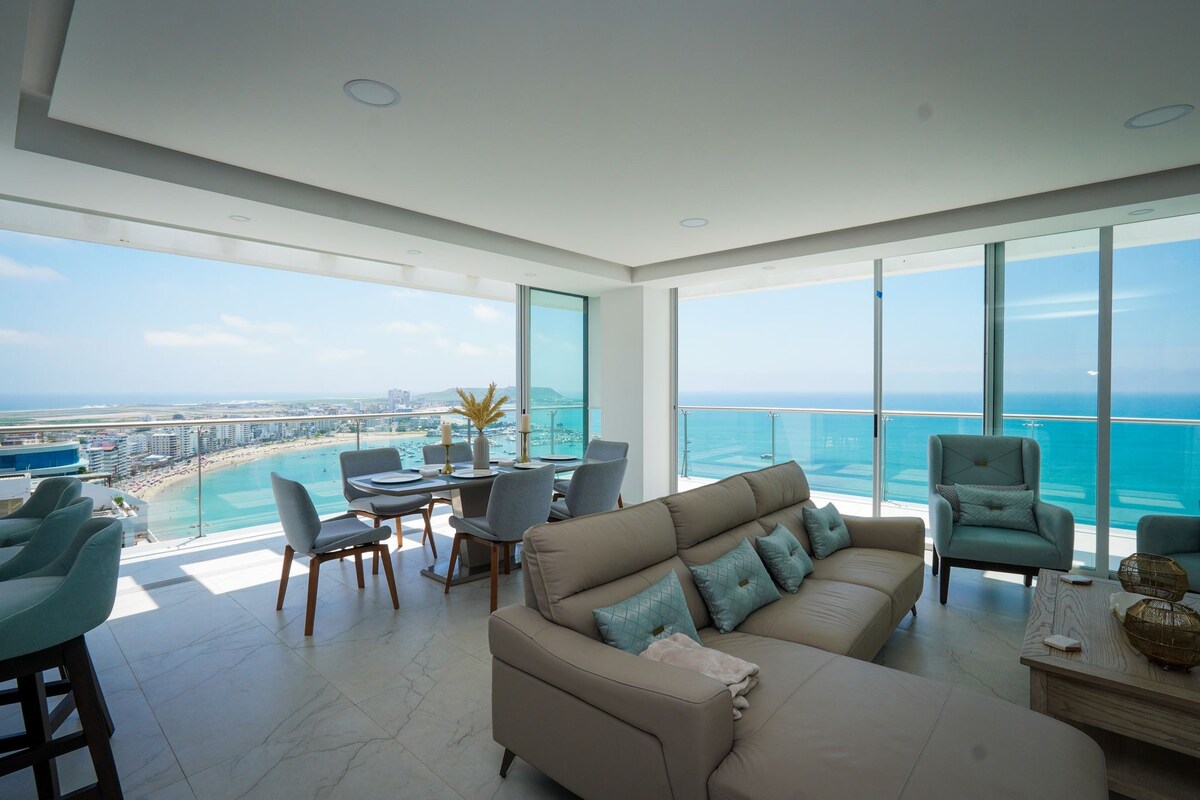 Vive una experiencia única en nuestro lujoso penthouse en el piso 24, con una vista panorámica inigualable al océano Pacífico. Relájate en una amplia terraza privada mientras disfrutas de los mejores atardeceres frente al malecón de Salinas. A solo pasos de la playa, restaurantes, bares y toda la vida costera que este destino tiene para ofrecer. Ideal para escapadas románticas, vacaciones en familia o simplemente desconectar con estilo y comodidad.