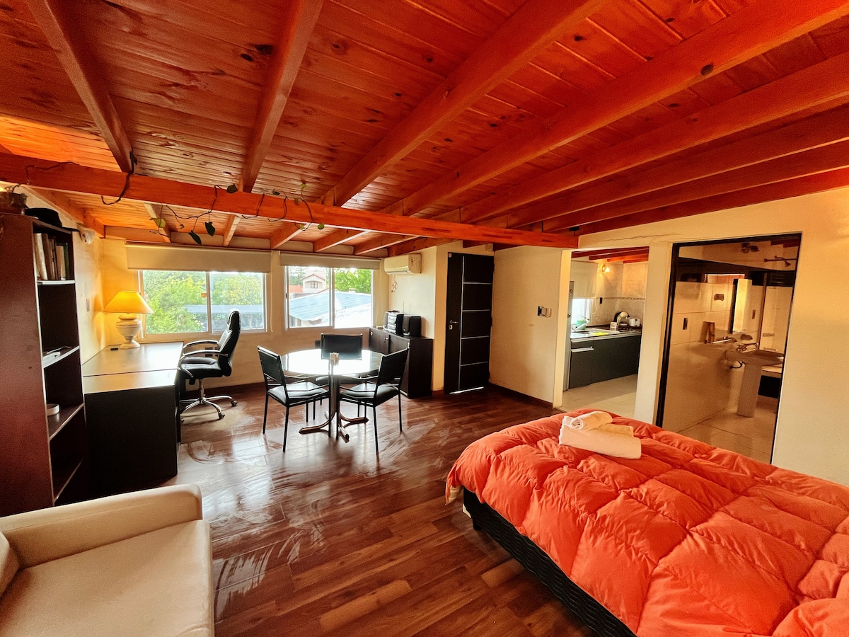Disfrutá de la calidez de este departamento tranquilo y céntrico. Nuevo a estrenar al igual que todo su equipamiento . Ubicado a 1 cuadra y 1/2 de la plaza principal. Silencioso al estar en el corazón de la manzana. Compuesto de 3 ambientes: Dormitorio con sommier queen size, amplio placard, Smart tv y aire acondicionado. Living con sillón que también cumple la función de 2 camas simples, mesa/sillas, Smart tv con direct tv y aire acond. Cocina con amplios ventanales, heladera y microondas.