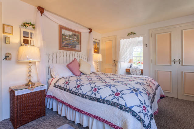 The Feng Shui Room, large, airy with inviting comfort. The Cal King bed is comfortable with it's foam mattress, luxurious down comforter and crisp clean sheets. The Feng Shui room has a little refrigerator. There is also a private bathroom with an out side bathtub and shower. There's an indoor one too of course. We will serve coffee around 8:00 and breakfast too if we like you. We have No cleaning fees or hidden charges.