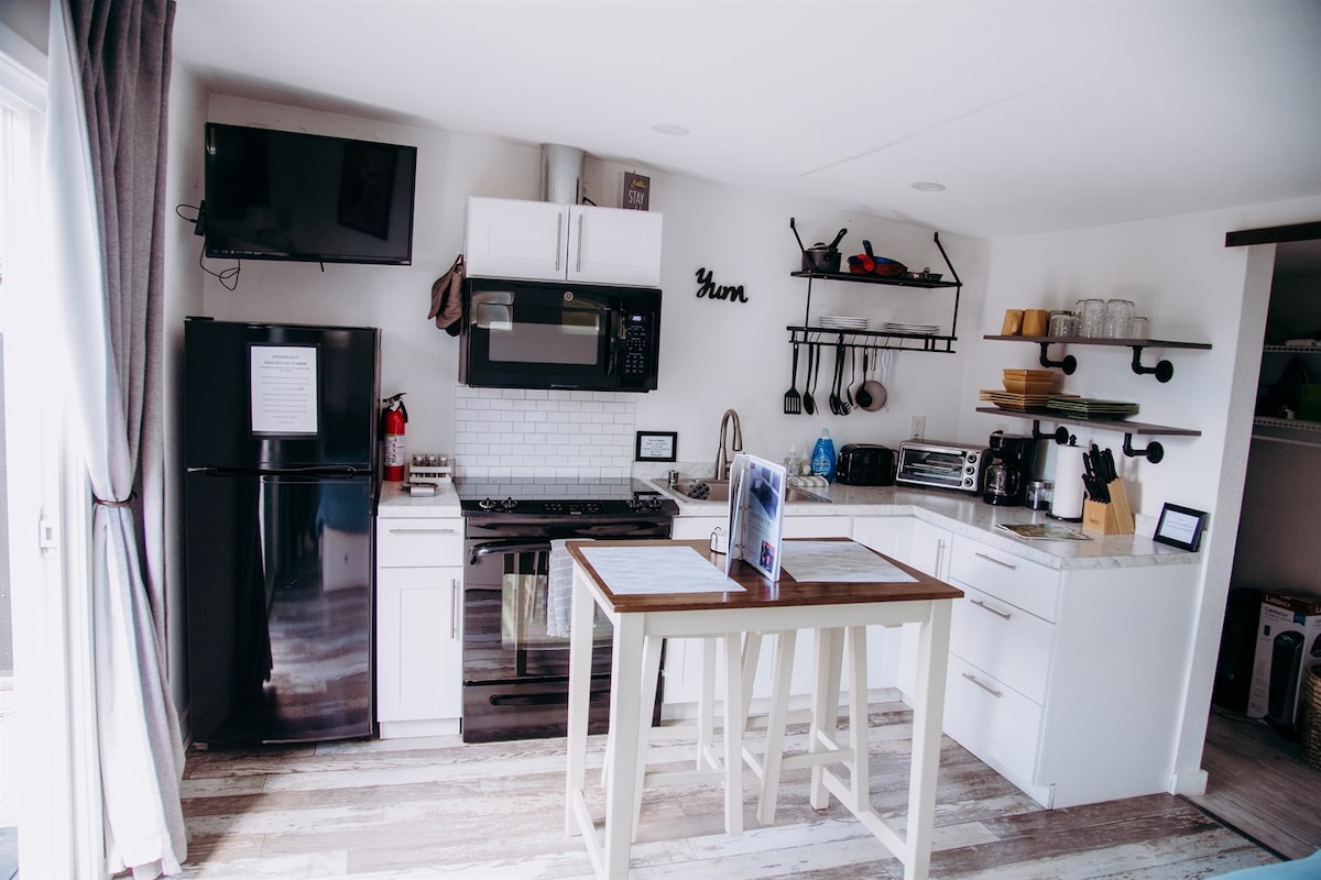 This adorable cottage is located 1 mile from downtown SLO and is equidistant to local wineries! Clean and tastefully decorated- equip with a full kitchen, comfortable sleeping accommodations and all the modern luxuries of home. This private studio is nestled on the backside of a beautifully landscaped property with a separate entrance and secluded patio area distanced from the main home offering you peace and serenity. Just a short stroll to Taste, SLO Co-Op, Del Monte's, Sally Loo's & many more