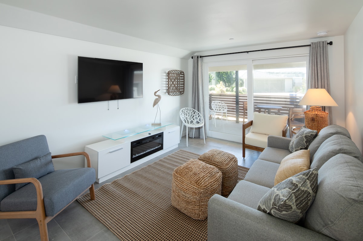 Brand new downstairs unit in a fourplex with superb location across from the beach and in downtown Cayucos! King in master, twin trundle in second, and sofa sleeper in living room. Bathroom has walk-in shower with double sinks. All new stainless steel appliances in kitchen. Flat screen TV (internet-ready; bring your streaming device), and electric fireplace. Patio with eating area. Shared common areas include laundry facility, outdoor kitchen (coming soon), and putting green!