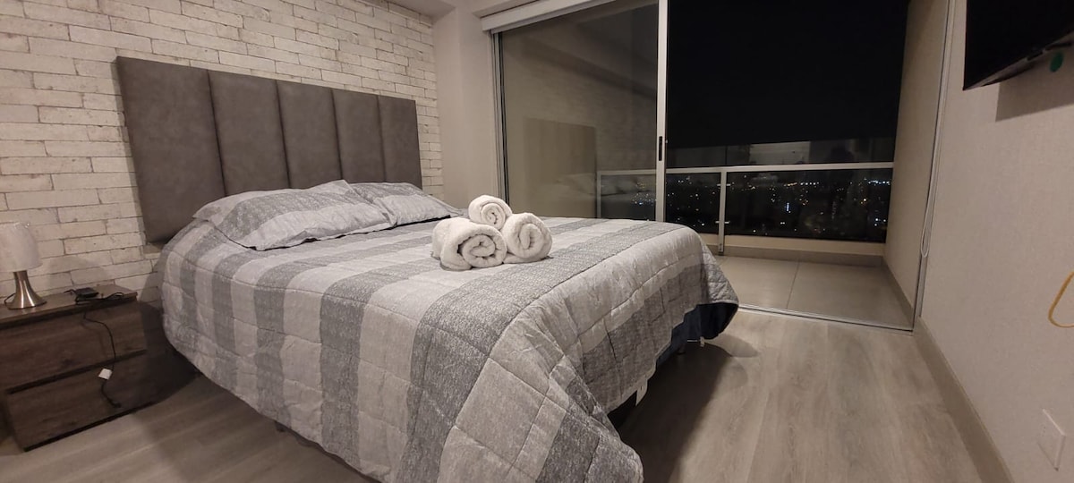 Moderno loft de estreno, muy bien ubicado y con increíble vista panorámica desde el piso 35. Fácil acceso a avenidas principales, centros comerciales, museo, tren, centro financiero, clínicas, gimnasios, parques. Cuenta con lavandería, baño principal , kitchenette, cocina equipada, walking closet, agua caliente, TV y WIFI. Áreas comunes: mirador de la ciudad, Rooftop, Co-working. Cerca a distritos turísticos como Miraflores, Barranco y Centro Histórico de Lima.