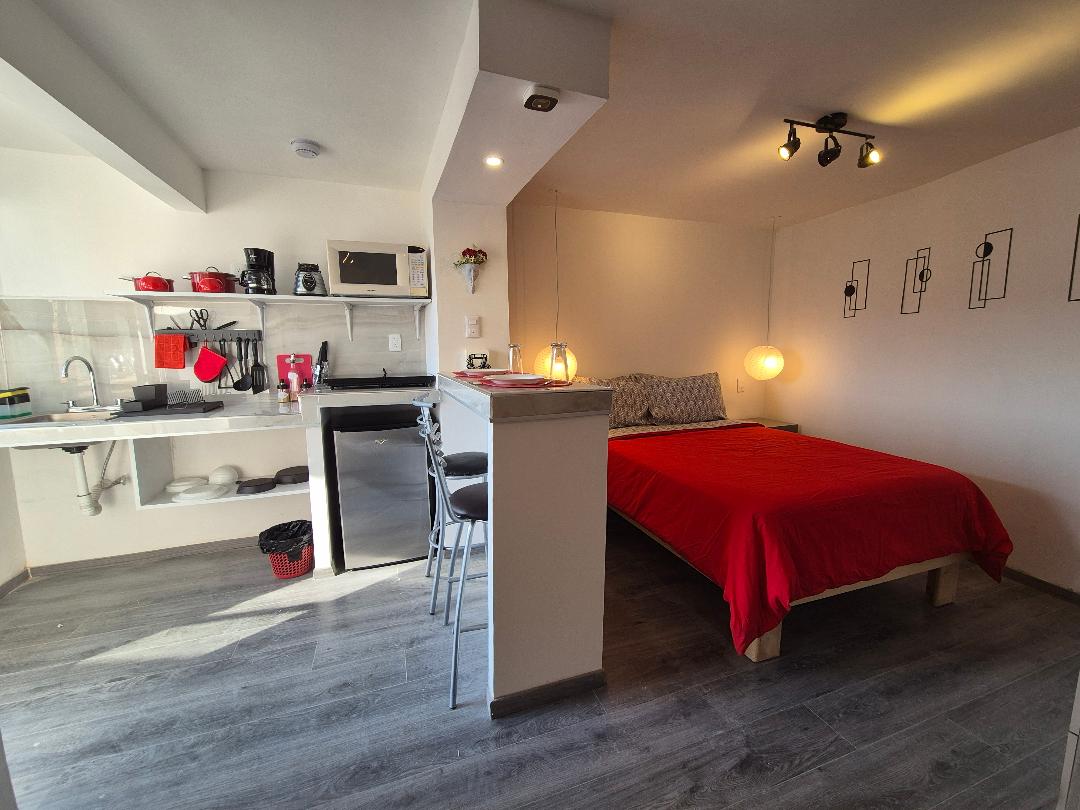 This is a lovely loft for two, located just a few steps from the Historic Center of San Luis Potosí. It has a private entrance and everything you need: a fully equipped kitchen, full bathroom, WiFi, TV screen, a small private patio with a hammock, amenities, excellent lighting — and plenty of inspiration!