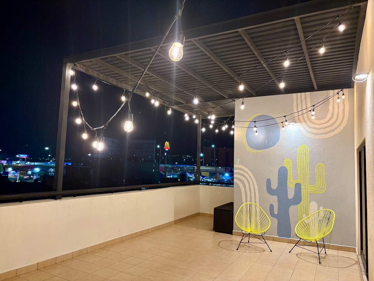 Deléitate de las magnificas puestas de sol que ofrece San Luis Potosí en nuestro loft con terraza ubicado a pasos de la avenida más importante de la ciudad, en el corazón del Centro Histórico, rodeado de las principales plazas históricas, restaurantes y museos. Te ofrecemos un refugio que combina lujo y comodidad en un entorno histórico incomparable. Disfruta de impresionantes vistas a las montañas y a la ciudad desde nuestra terraza privada. Un lugar perfecto para relajarte.