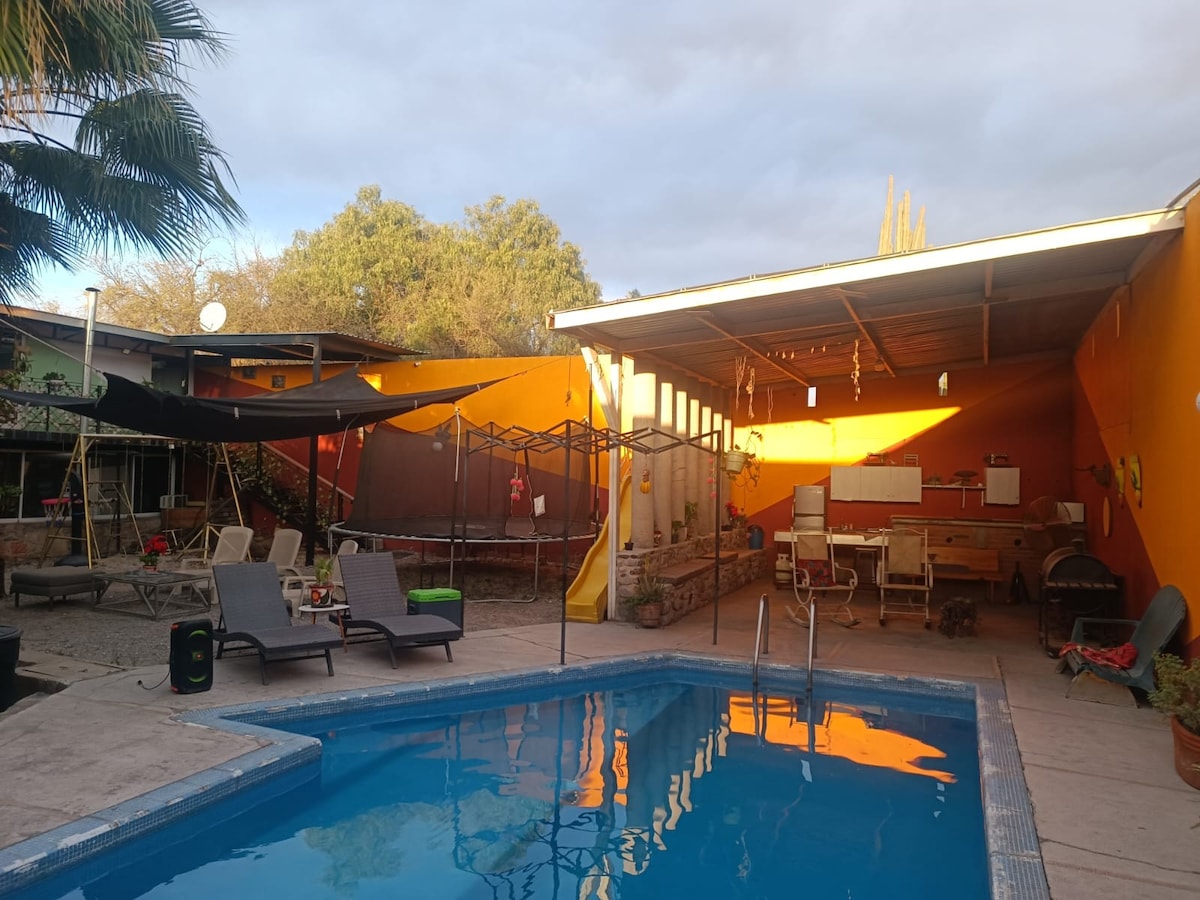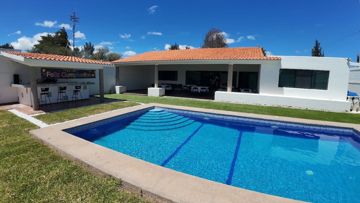 Ideal para ir con la familia, pasar el fin de semana con los amigos ó con tu pareja. En nuestra casa encontrarás comodidad y amplios espacios para disfrutar. A 15 minutos del centro de San Luis – cuenta con amplios jardines y áreas de descanso así como 3 habitaciones equipadas con TV y capacidad para 6 personas: 2 baños completos, sala y barra desayunadora, cocina equipada, palapa con asador y bar con fregadero. Ideal tambien para visitar cerro de san pedro. No se permiten fiestas ni eventos.
