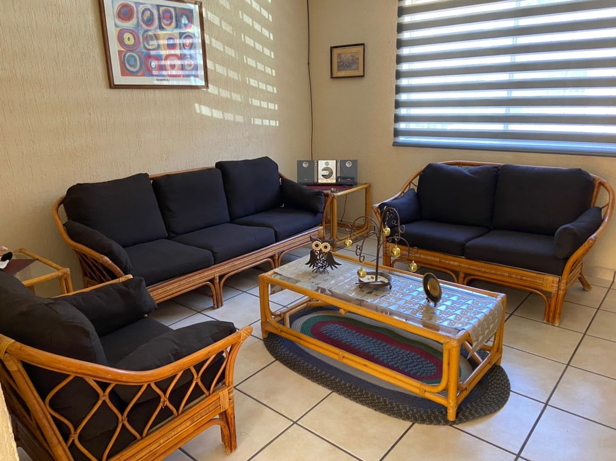 Amplio alojamiento en planta baja, un solo piso sin escaleras, ideal para personas con movilidad reducida.. Cocina totalmente equipada, estufa, refrigerador, horno de microondas, utensilios de cocina, etc. Barra desayunador, comedor Tres amplias habitaciones con closet. Dos baños completos.. Cochera cerrada para un carro o camioneta mediano-grande En rentas de 7 persona ofrecemos una recamara extra ¡¡¡