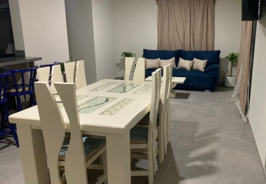 Amplio alojamiento en planta baja, un solo piso sin escaleras, ideal para personas con movilidad reducida.. Cocina totalmente equipada, estufa, refrigerador, horno de microondas, utensilios de cocina, etc. Barra desayunador, comedor Tres amplias habitaciones con closet. Dos baños completos.. Cochera cerrada para un carro o camioneta mediano-grande En rentas de 7 persona ofrecemos una recamara extra ¡¡¡