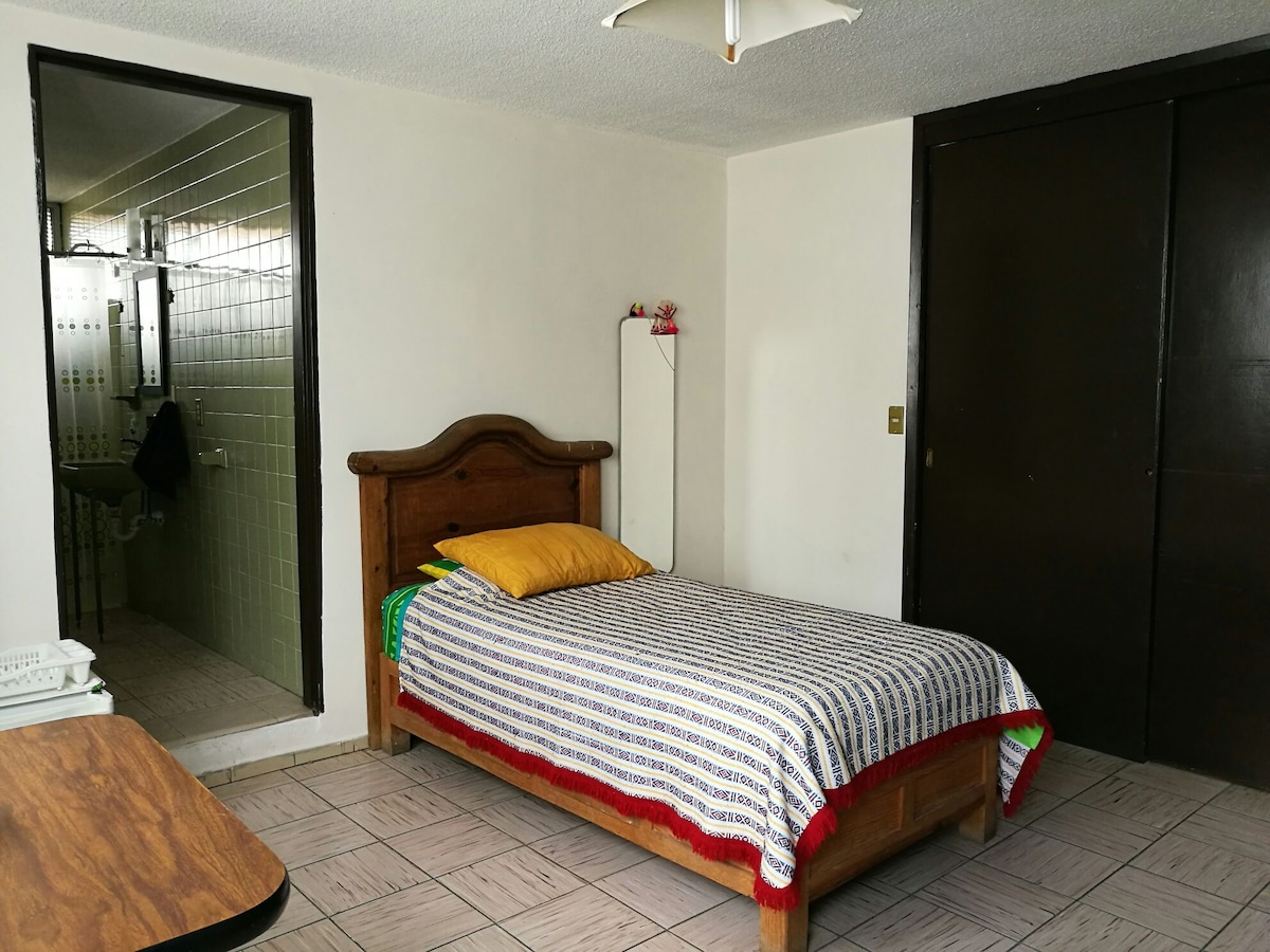 Es una casa dividida y rentamos un cuarto-estudio totalmente independiente, tiene un baño completo grande y está totalmenta amueblado, cuenta con una cama, escritorio-librero, closet muy grande, mesa para dos personas, despensa, parrilla electrica y frigobar. Estamos en una zona muy segura y centrica, es una zona familiar, hay un hospital a una calle, oxxo de 24 horas, panaderías y tiendas alrededor.