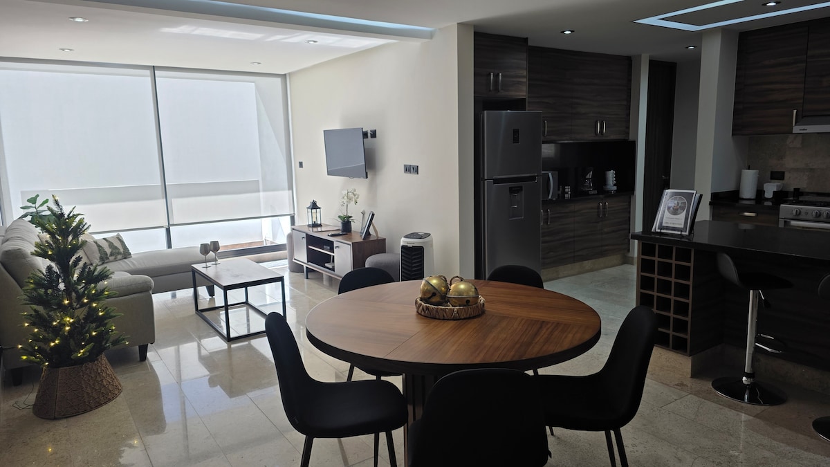 Excelente ubicación, moderno, cómodo y amplio. Ideal para familias, parejas, viajes de trabajo y academicos. WiFi y Netflix, estacionamiento, 2 recámaras, 3 baños, cocina equipada, sala-comedor y 3 climatizadores. A 1 cuadra de Centro Comercial El Dorado y Oxxo, A minutos de Av. V. Carranza, Centro Histórico y Zona Universitaria. A solo 3 min de Blvd. Río Santiago y a 10 cuadras de Blvd. Salvador Nava, principales vias rápidas para llegar a Zona Industrial, aeropuerto y central de autobuses.