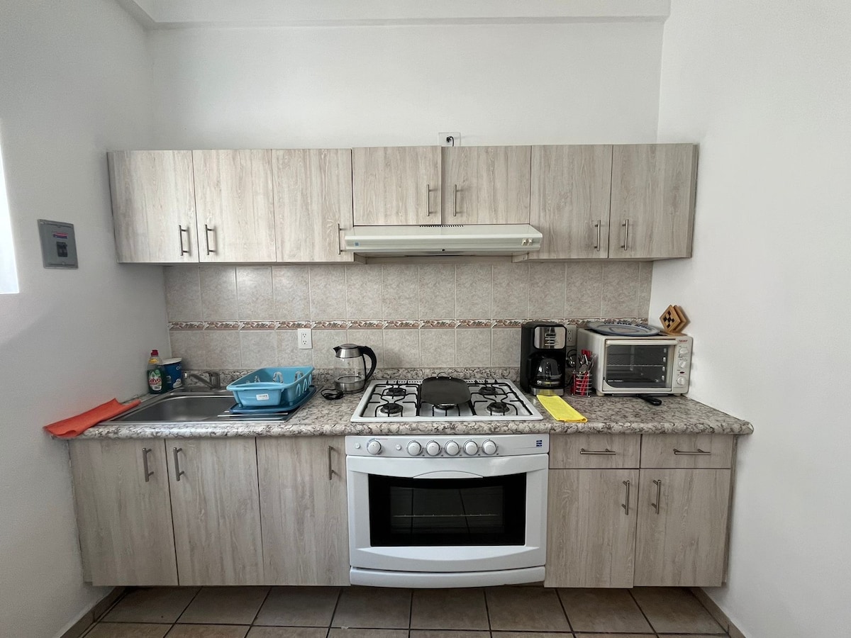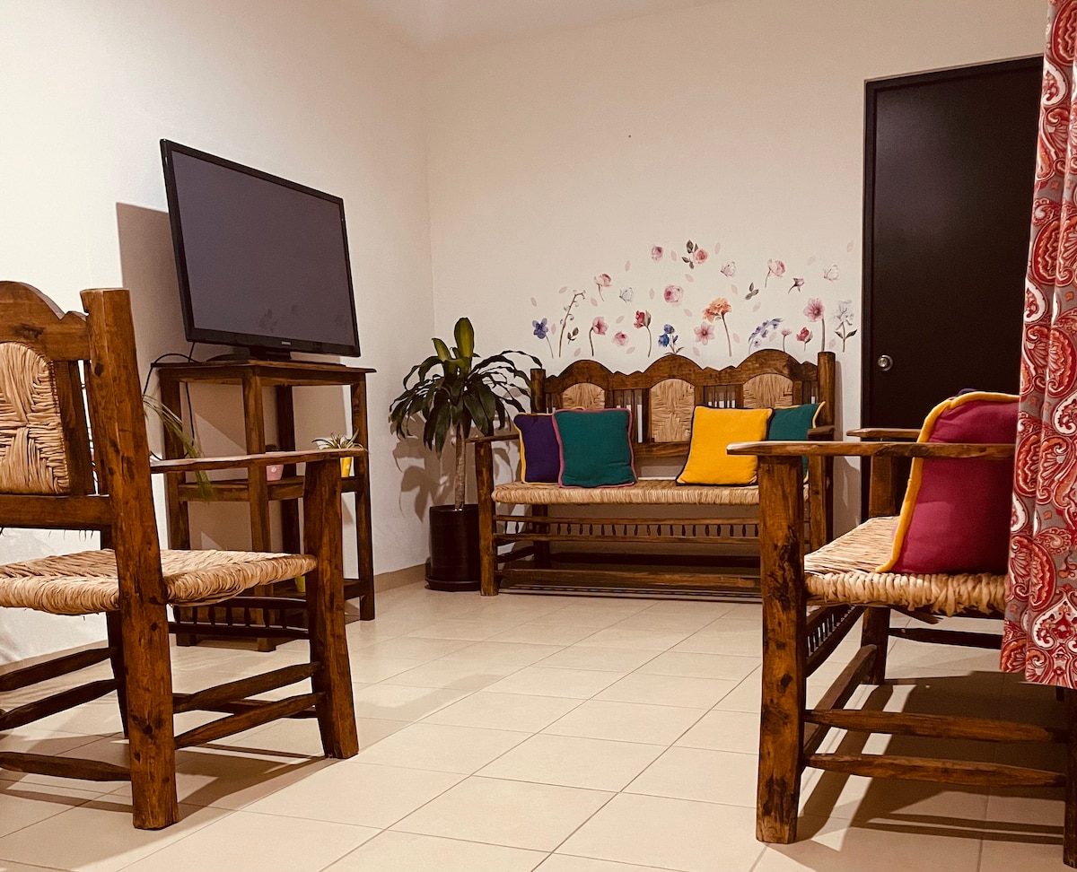 HERMOSO DEPARTAMENTO, AMPLIO, COMODO, SIN ESCALERAS. SOLO PARA AUTOS MEDIANOS. GRAN CLASE Y ESTILO TOTALMENTE EQUIPADO. CONSTA DE UNA AMPLIA RECAMARA CON ESPACIO PARA TRABAJAR EN TU COMPUTADORA, WIFI, PANTALLA, BAÑO COMPLETO PRIVADO Y UN AMPLIO VESTIDOR. SALA CON SOFA CAMA, COMEDOR Y COCINA EQUIPADA CON CAFETERA, TOSTADOR, LICUADORA ETC. 1 MEDIO BAÑO. ADEMAS DE UNA PEQUEÑA Y MUY AGRADABLE TERRAZA, Y COCHERA CON PORTON ELECTRICO PARA AUTO MEDIANO.