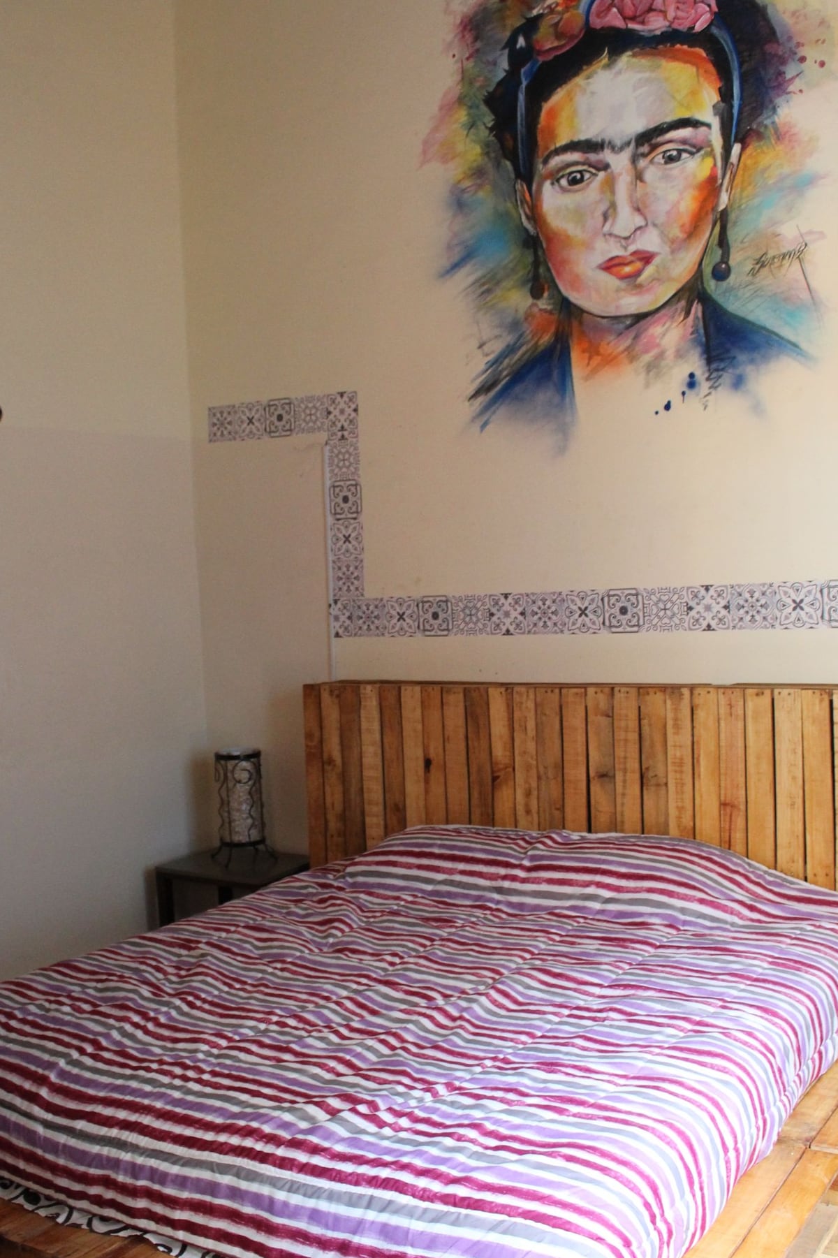 linda y comoda habitacion con murales y decoración inspirada en Mexico y Frida Khalo, es privada con todos los servicios disponibles