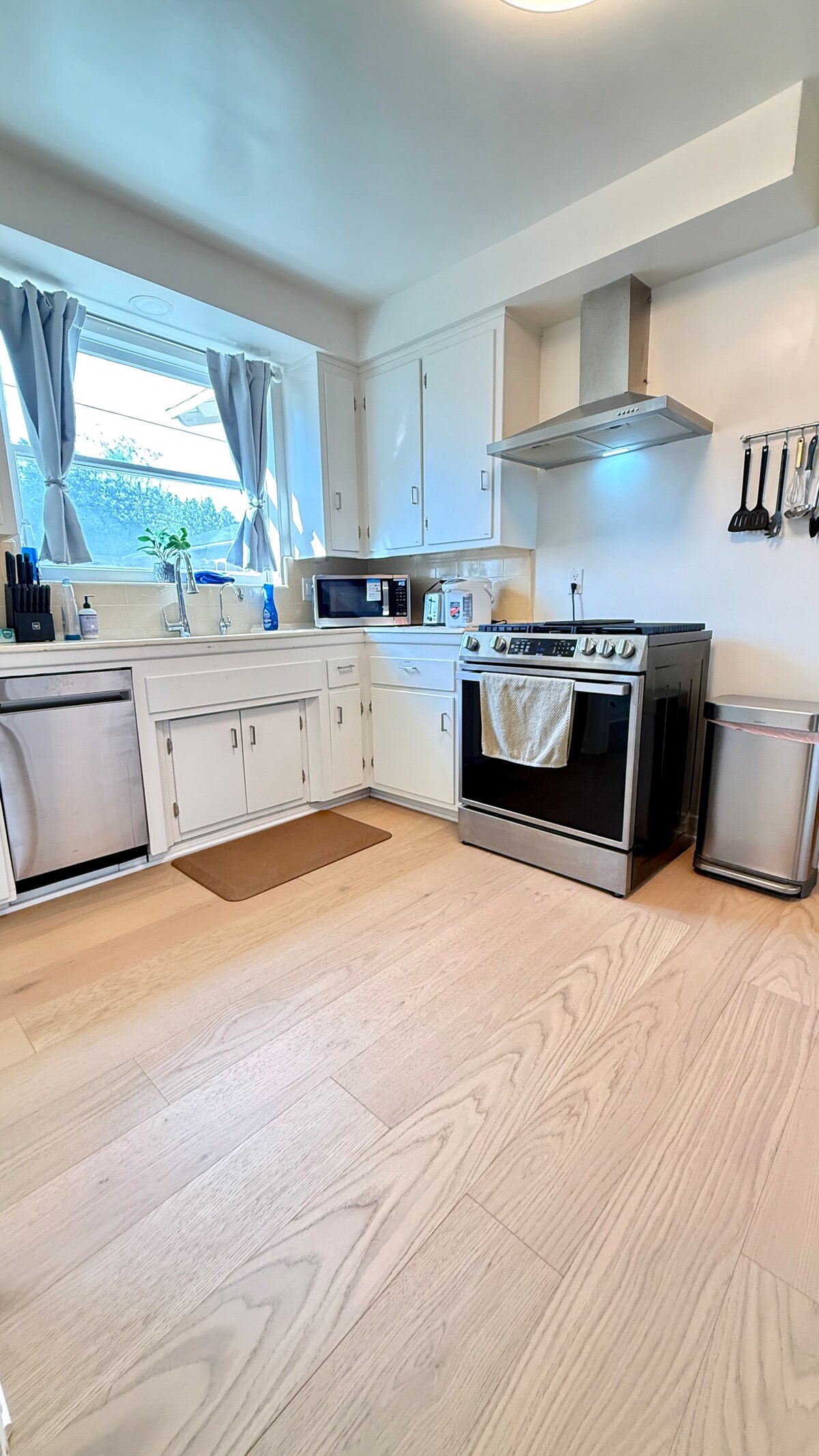 This is a very bright and clean home with a big open front yard and a big private back yard for your group or family to enjoy. We have provided every amenity we can for your comfort and entertainment. There are 3 good sized bedrooms. All three bedrooms have new model Tempur-pedic Queen beds with motorized adjustments for raising the back and/or feet, premium linens, and new 4KTVs with ROKU, Netflix, Amazon, and premium Spectrum Cable. There is plenty of closet space in each room for your clothes and luggage. The house has new central air and heat with a smart thermostat plus new plumbing and large hot water heater for your comfort. You are free to set the temperature to your liking. In this location, Mother Nature’s tree canopy over the property ensures you will always be comfortable while enjoying plenty of the best California sunshine. The kitchen is well equipped for making a cake or a simple dinner whether you need to bake, fry, steam, stir fry, make perfect rice, or just microwave your leftovers, you’ll have what you need. Outside there is a gas grill and outdoor table with teak wood benches right off the kitchen steps in the side yard. The laundry room is fully stocked with washer and dryer, iron, ironing board, and cleaning supplies. If you are eating inside, the dining area is next to the kitchen through the swinging door. The dining room offers Turkish chairs and a reclaimed wood table and features floor to ceiling glass doors with a view of the mountains. There’s a comfortable writing desk for anyone that might need to wrap up some important work as well. The WiFi is 100mb and the newest networking technology to connect devices throughout the house. The living room features comfortable furniture and a great coffee table. In addition to the 4K TV, premium cable, Netflix, and Amazon, there’s a blue tooth sound system you can connect your phone to so you can enjoy your favorite music. The back yard has ample space with beautiful landscape and shade to enjoy a picnic, a sunset, or a sunrise. Relax outside and enjoy a cup of coffee or tea in the morning and look forward to an evening with a great meal, family and friends. In the bathroom, you’ll find shampoo, conditioner, tooth paste mouthwash, cotton balls and swabs. In the hall closets you’ll find supplies, linens, towels, beach towels, blankets, chairs for your trip to the park or beach and a variety of our favorite wine to drink. The house also has board games, a variety of books for kids and adults, puzzles, cards, baseballs, soccer balls and an outdoor playhouse. When requested, additional beach gear and bikes are also an option but please let us know in advance so we can stage them for you! Park up to 3 cars in the driveway in front. More gated parking is available through the back gate as well. The back parking area is suitable for parking even a motor home or a boat. Pasadena Permit Number SRH2018-00134 and SRU2018/-00036 The house has a smart lock so no need to manage keys. We can point you to a great restaurant, nail salon, wine bar, yoga studio, pub, wine bar, beach, a childcare provider in the area or a park for the kids. Let us know if you have any special requests. We are here to make sure you are comfortable and that you enjoy your time in Pasadena. The house is in a laid-back neighborhood with great parks, shopping, a convention center, and restaurants all within a short drive away. The metro gold line is just a few blocks away and offers trains to Los Angeles. 210 Fwy and Gold Line train are a minute away. Uber rides are never more than a 3 minute wait. Our home is located on a boulevard and there is traffic and some traffic noise on the front porch. The home is on a huge lot set back far from the street so is quiet inside.