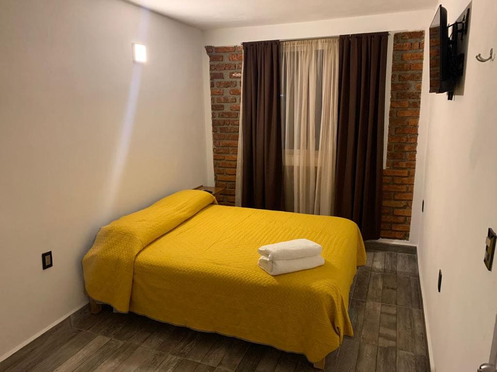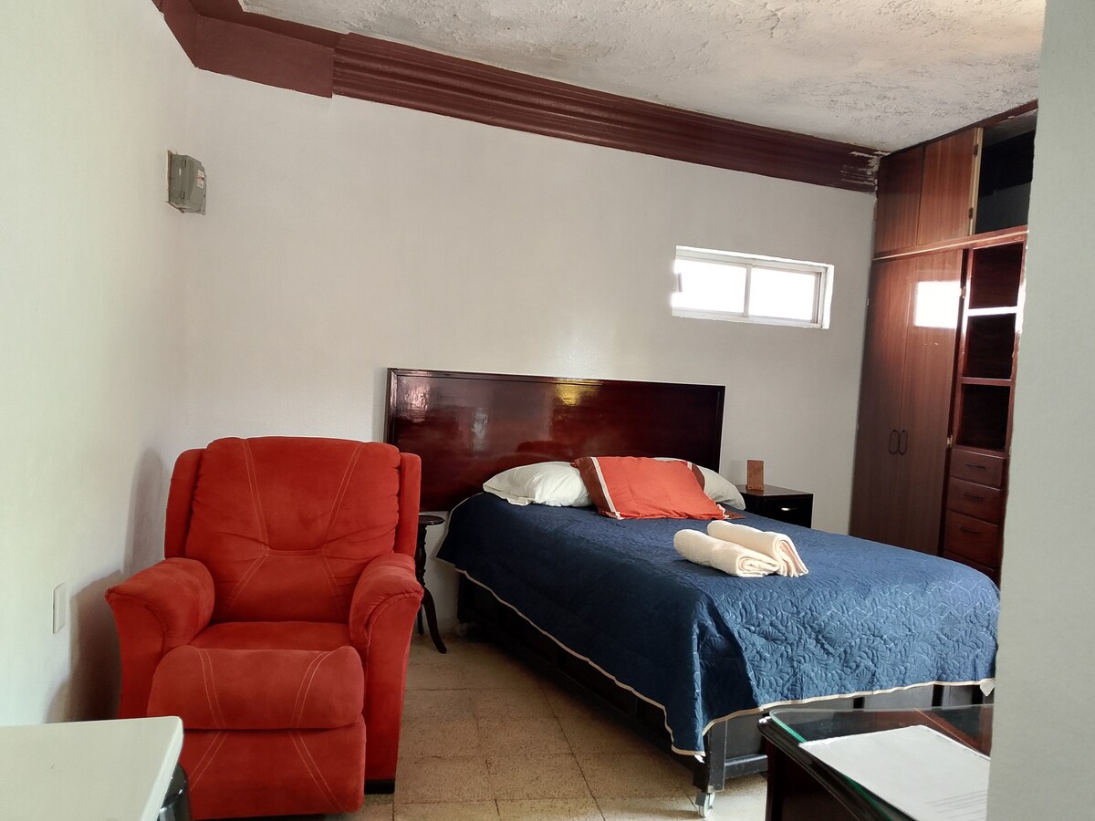 Disfruta de una experiencia única en nuestro encantador alojamiento, a solo una cuadra de la zona arqueológica. El espacio combina confort, estilo y conexión con la historia local. Cuenta con una cómoda cama y un sofá/cama que acomoda a dos huéspedes más. La luz natural se filtra por las puertas turquesa, añadiendo frescura al ambiente. Relájate en el área ajardinada o revitalízate en la ducha tipo lluvia. Con Wi-Fi, cocina equipada, ropa de cama, toallas y entrada con cerradura inteligente.