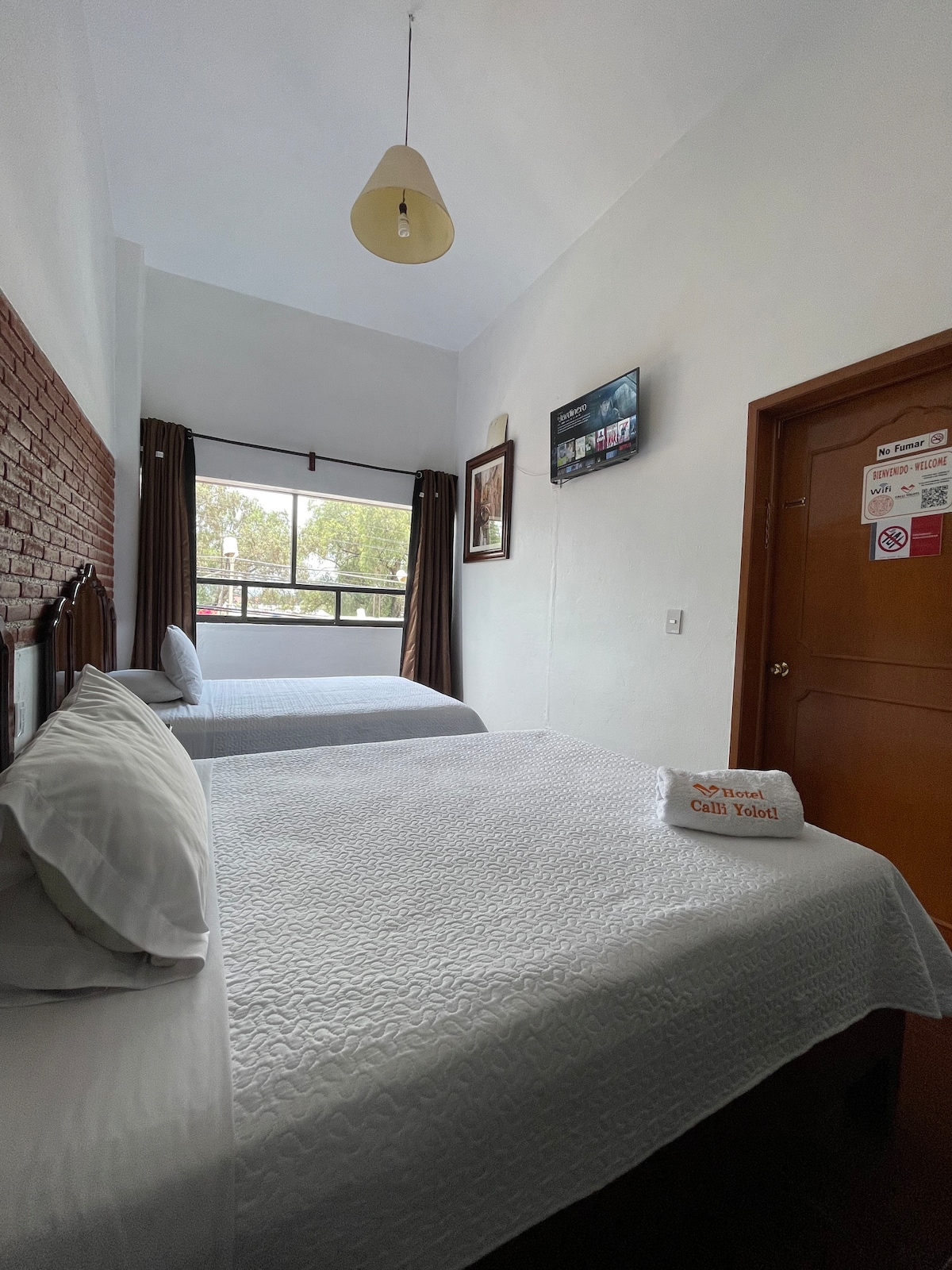 Habitación 1 es un alojamiento de Calli Yolot, en la planta alta de una casona convertida en hotel boutique. Contamos con dos camas matrimoniales, pantalla inteligente de 32”, baño completo, regadera con agua caliente, internet, tocador, todo esto en un ambiente prehispánico propio de Teotihuacán. Al exterior de la habitación, encontrarás áreas comunes recreativas, en el lobby y en el espacio denominado corazón podrás disfrutar de alimentos y otros servicios, así como juegos de mesa.