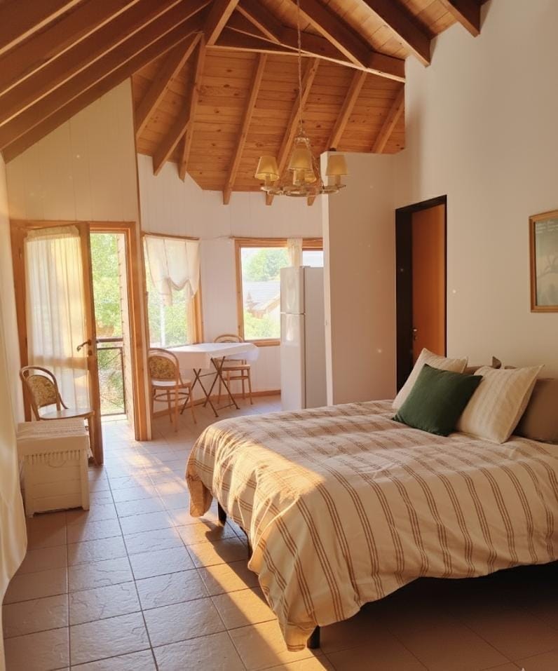 Moderno Monoambiente en el centro de San Martin de los Andes. Totalmente equipado con equipamiento de cocina, toallas, ropa de cama y todo lo necesario para disfrutar de tu estadia. El dpto esta ubicado a 2 cuadras del sector comercial por lo que permite tener total tranquilidad pero estar facil y rápidamente en el sector de restaurantes, negocios y supermercados. Eventualmente, en el dpto. puede ubicarse una tercera cama en un sector superior para un niño/a, que se evalua en cada caso.