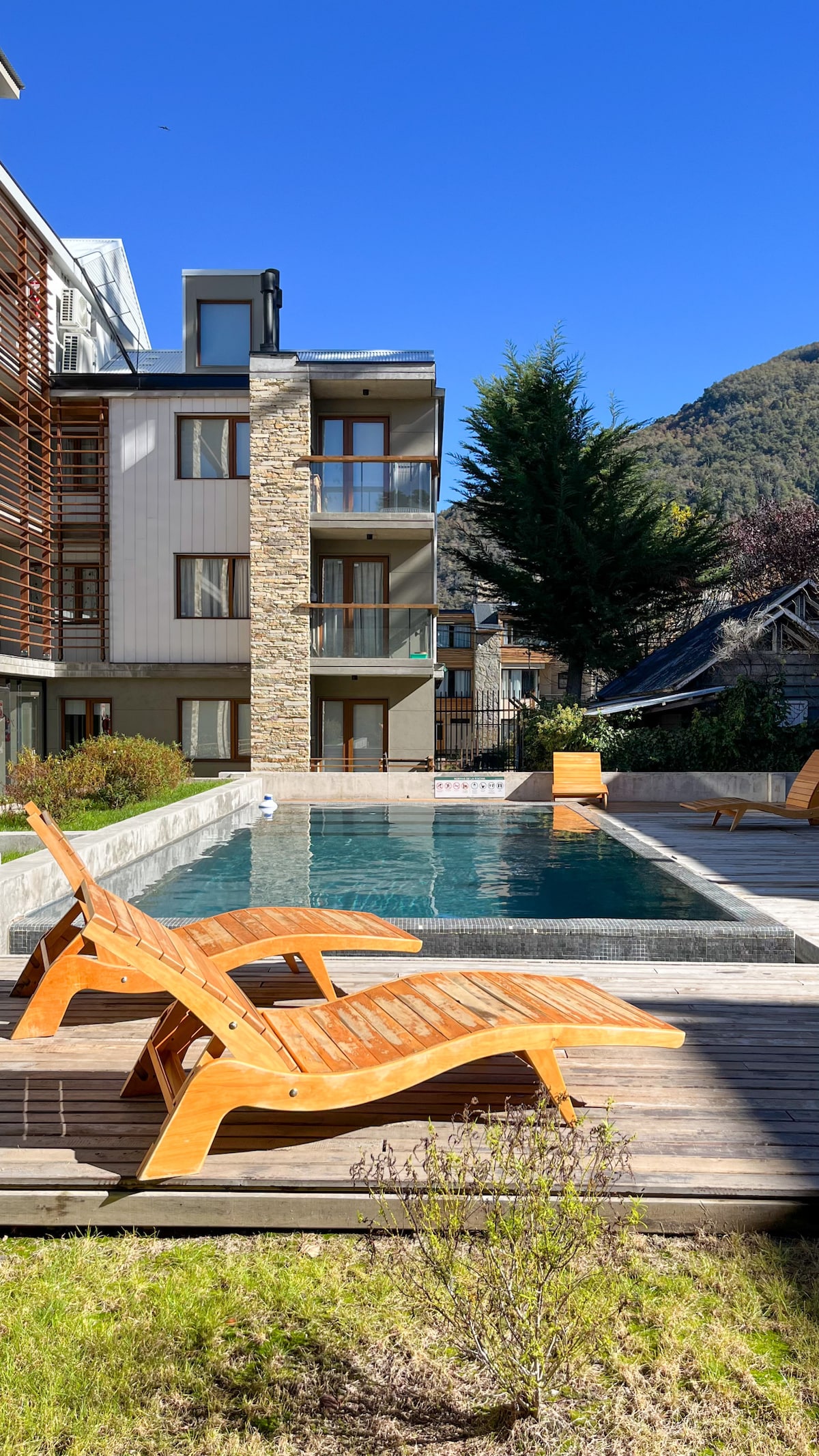 Hermoso departamento, amplio y luminoso, cuenta con piscina templada. Ubicado a 300 mts de la Plaza Sarmiento, 400 mts de la calle principal de San Martin de los Andes, en la Patagonia Argentina. Cocina con equipamiento super completo, baño con bañadera, living, 2 sommiers individuales que se pueden unir haciendo una cama matrimonial (twin-together), ropa blanca, Smart TV y WIFI. En el Edificio: pileta, gimnasio, sauna, sum con parrilla y lavadero (estos 2 últimos con costo adicional)