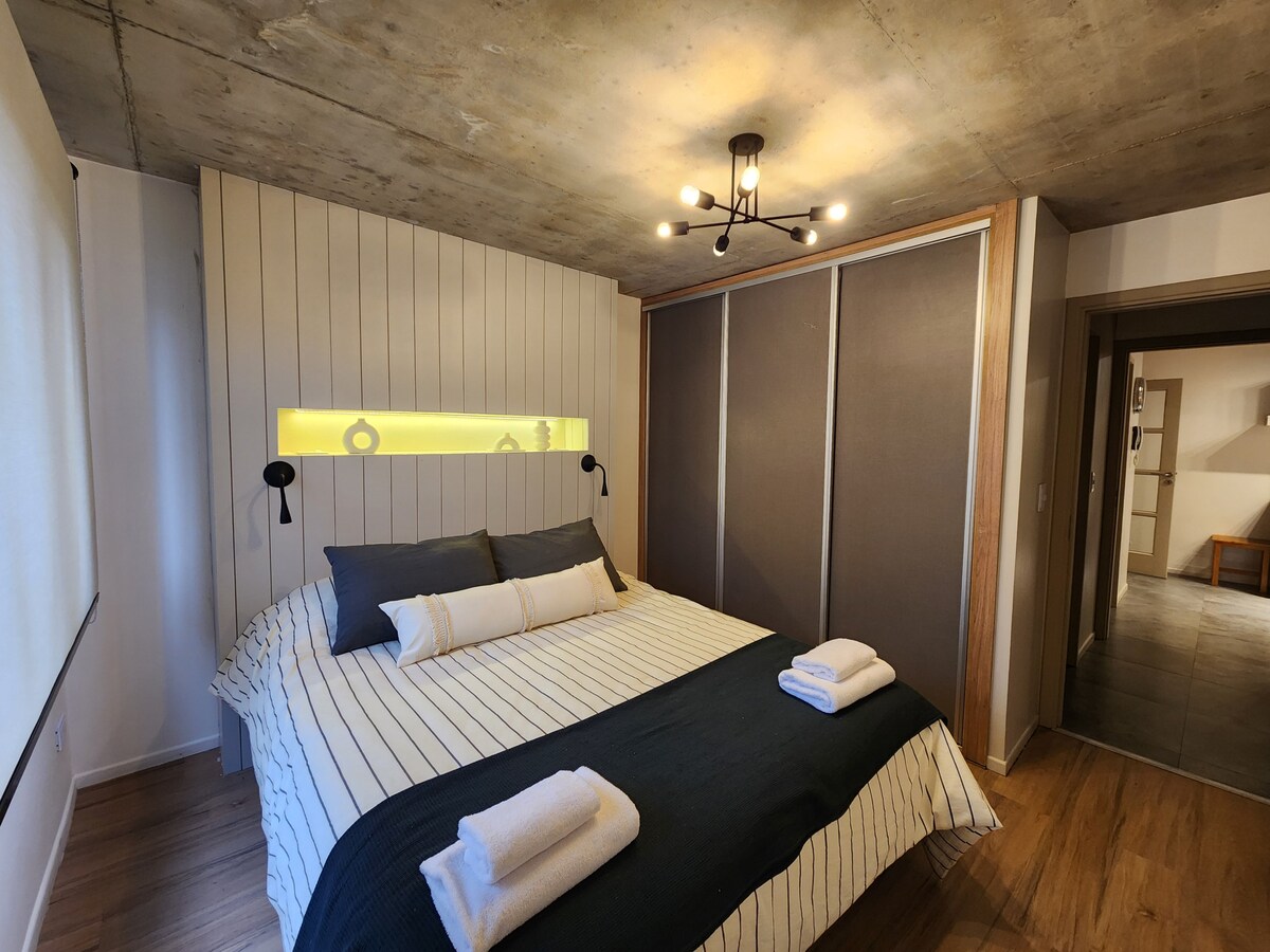 Hermoso Monoambiente de 40m2 recientemente estrenado, muy luminoso y moderno, con vista hermosa desde su balcón del primer piso. Dispone de una cálida y cómoda ambientación y está equipado con 1 sommier queen y 1 cama simple de excelente calidad; cocina super equipada con barra desayunadora y baño completo. Tiene smart TV con cable y wifi. Ubicado en pleno centro, a 3 cuadras de la Av. principal, a 8 del lago y a pasos de comercios como restaurantes, rotiserías y supermercados. Un depto soñado.