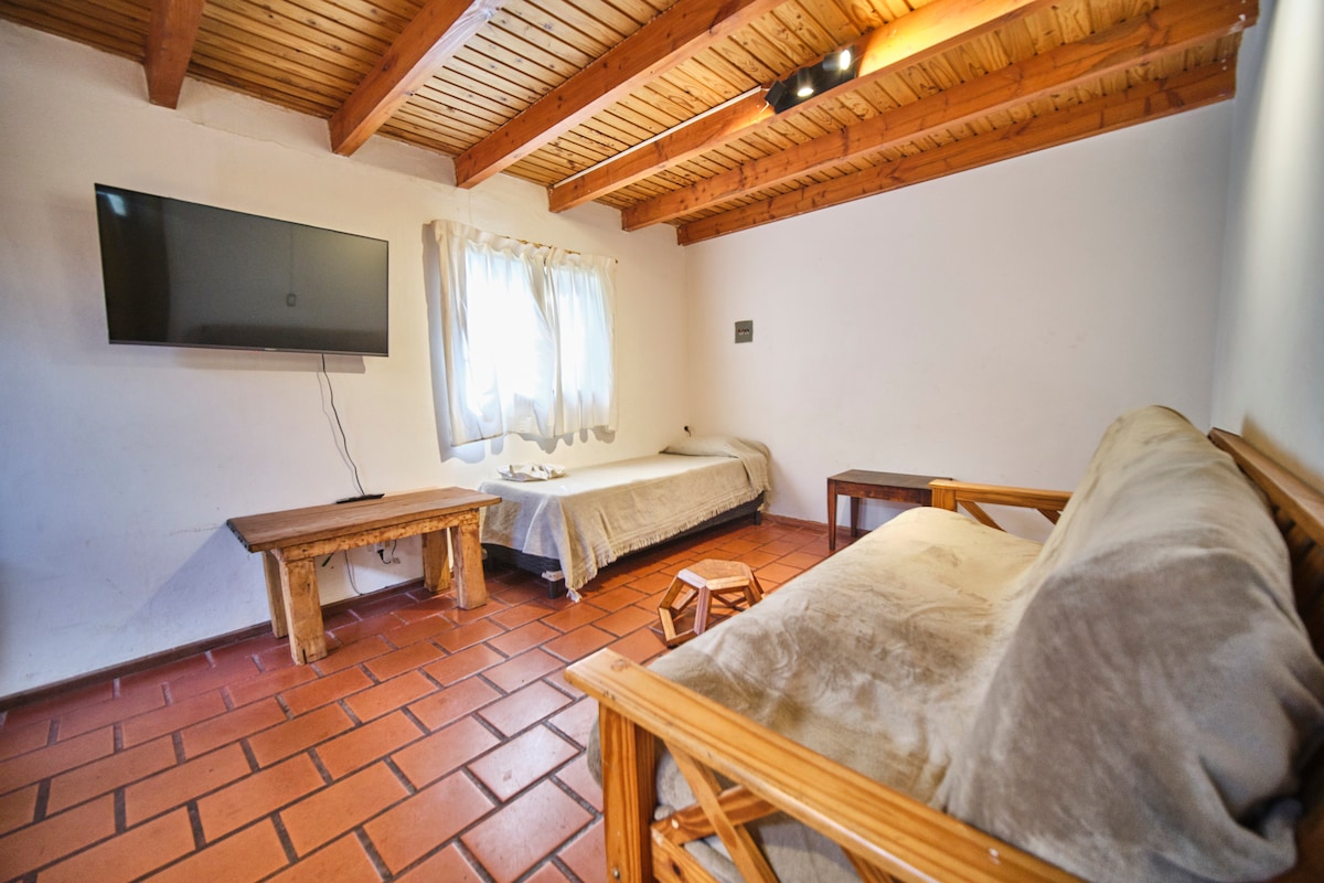 Desde este alojamiento perfectamente ubicado, disfrutá de tener acceso a todo. Monoambiente grande donde se encuentra la cama doble y el living-comedor. Equipado con muebles inteligentes que se pueden guardar o desplegar según las comodidades de cada uno. Cuenta con cocina completa y un baño. Hay lavarropas y patio en espacios comunes. Smart tv y WIFI Ropa de cama y toallones.