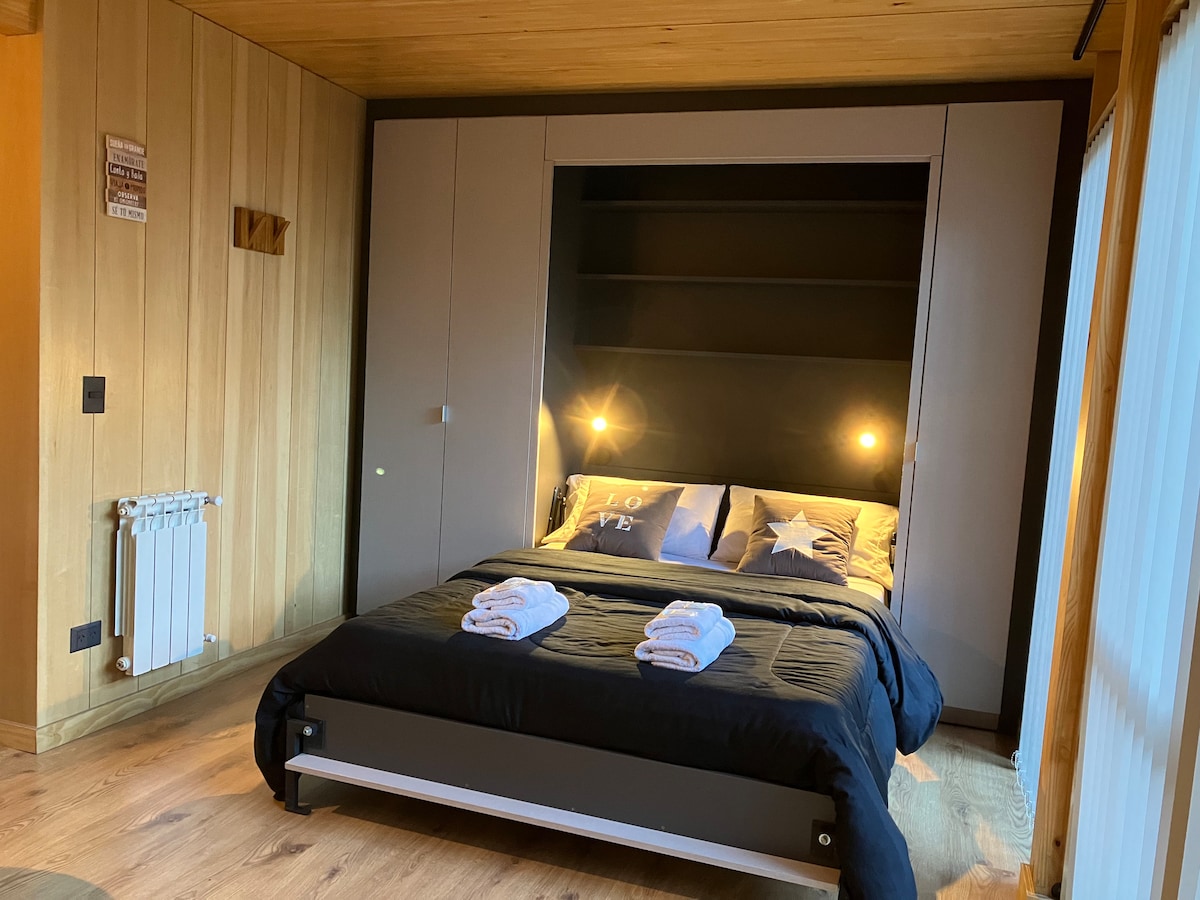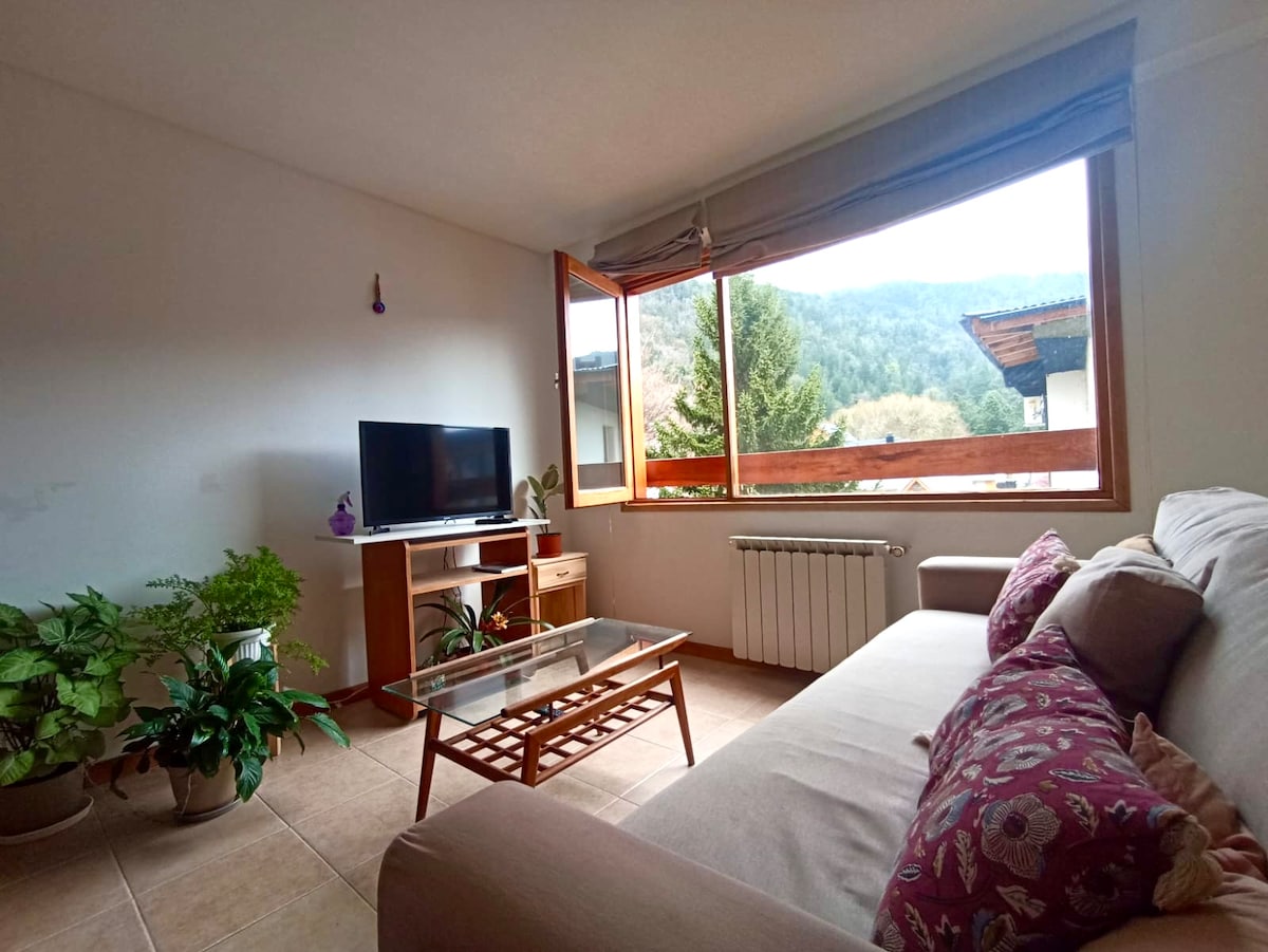 Hermoso departamento Céntrico. Cochera privada al descubierto a 1 cuadra. Equipado para 3 personas. Cuenta con una habitación muy luminosa con vista a la montaña y baño en suite. Un living comedor con una cama, toilette, cocina y un gran balcón para disfrutar de la vista. La habitación y el living cuentan con cortinas blockout.Hay un gym de uso común, una sala con tv, pool, ping pong y Laundry room. La ubicación es excelente y a pocas cuadras del lago Lacar. La construcción es moderna y cálida.