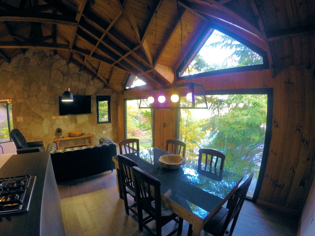 Relax at our cozy mountain home and be blown away by the gorgeous, uninterrupted views of incredible Patagonian landscapes. A peaceful & unique place to stay with one double bedroom and one twin room with large bunk beds - perfect for a family. Enjoy amazing sunrises and sunsets on our 16 metre deck, surrounded by nature, with the occasional condor swirling overhead. Less than 10 minutes from the ruta 40, and 20 minutes from downtown San Martin de los Andes.