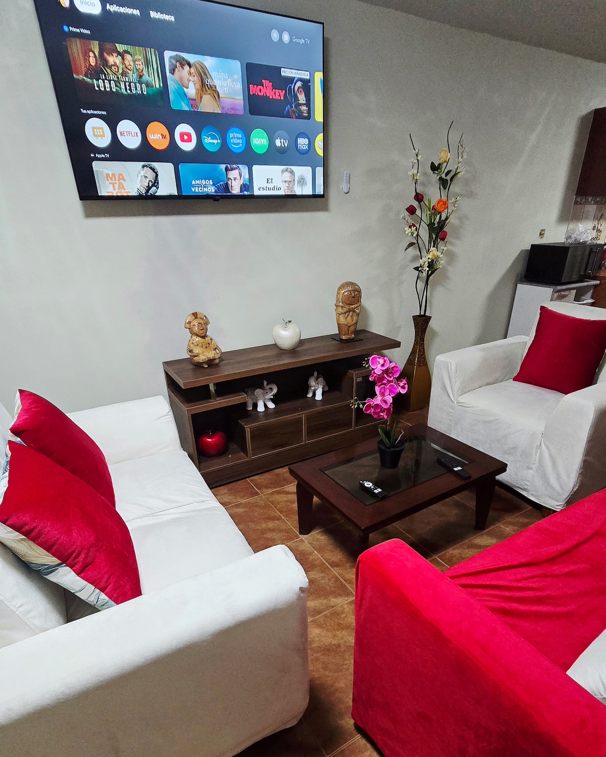Si deseas sentirte como en casa y disfrutar de estancias agradables en un lugar ubicado a 10 minutos del aeropuerto. Mi Dpto. es espacioso, privado, con todas las comodidades y de uso exclusivo para una o dos personas. Cuenta con sala, comedor, cocina, lavandería, una habitación con cama dos plazas, y dos baños. La cocina está completamente equipada y existe un minibar. Cuento con Wi-fi y Netflix ideal para tus momentos de descanso. Además a 5 minutos hay un centro comercial.