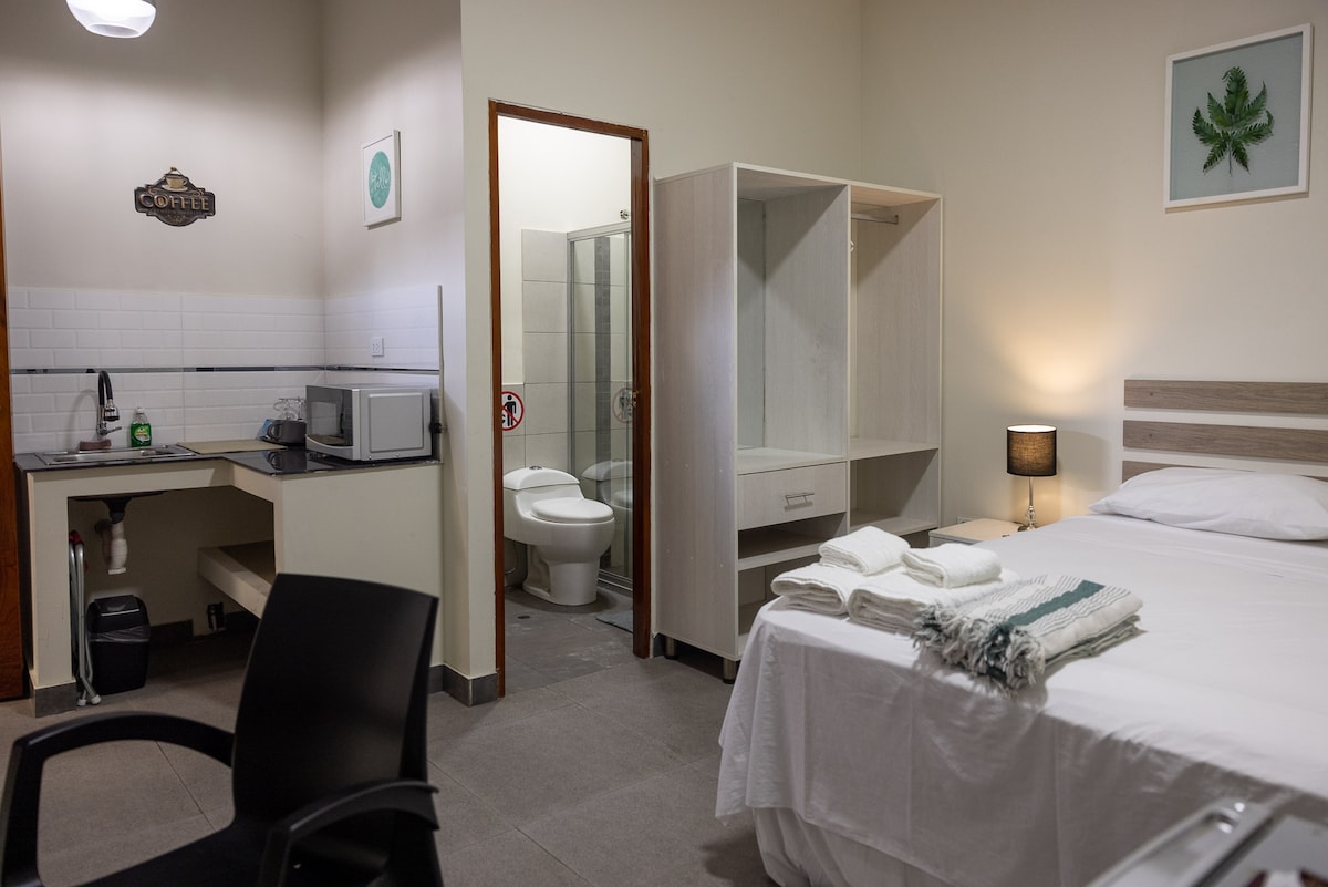 Loft acogedor de estreno, amplio de 24m2, con acceso independiente. * Cocina equipada, microondas, frigobar. * Baño propio, aire acond, TV 50". * Cama Matrimonial de 2 plazas. * Estacionamiento para motos y más!!! * Céntrico, a 2 cuadras de Plaza Vea, Colegio Innova, Coliseo de Tarapoto. * A 5 minutos de la plaza Armas. * A 10 minutos del aeropuerto. *SOMOS FLEXIBLES con la hora de checkin y checkout (sujeto a disponibilidad) envíanos tu consulta y te respondemos inmediatamente.