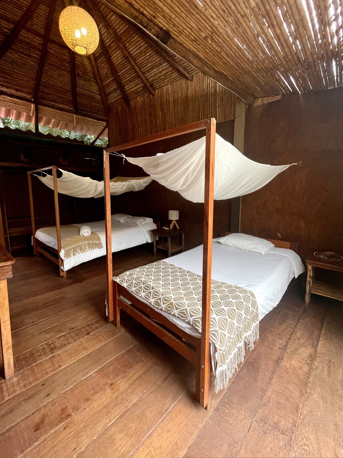 Habitación con cama matrimonial y cama simple en segundo piso, piso de madera, con balcón privado con vista al río y baño privado en primer piso. Cuenta con una mesa de trabajo. Disponible para parejas con hijo/a menor de 5 años, sin costo adicional.