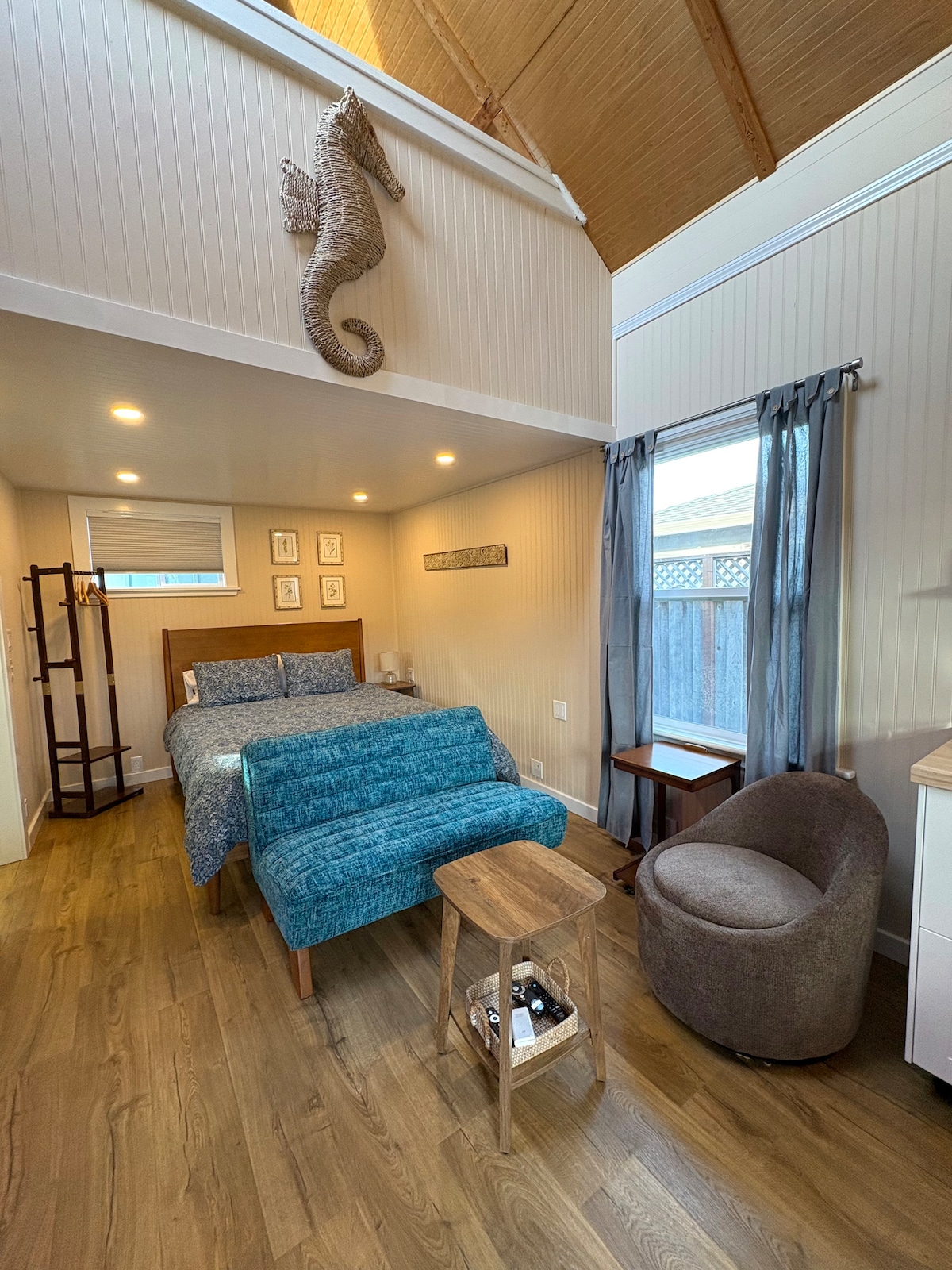 Light the fire pit and dress for dinner in the vine-covered garden at a peaceful retreat with a soothing waterfall. Zen beachy decor and coastal paintings set the scene indoors, with abundant natural light enhancing easy open-plan living. Pets are welcome with a small cleaning fee of a $50 (one time fee) and additional pets $25 (one time fee). The main room is 12'x17'. Closet is 6 1/2' long. Bathroom 4'x5 1/2' + shower 3'3" x 3'3". kitchen 4 1/2' x 8". Simple breakfast served. Your own private entrance, plenty of parking on the street, nice neighborhood. We are available if you have any questions or need information on the area. 2 night minimum please. The cottage is tucked away off the street in a quiet, safe neighborhood where residents walk their dogs in pleasant weather. Nearby downtown Redwood City is home to shops and groceries and freeways and public transportation are within easy reach. There is a bus that runs at the corner of our block, it would take you to downtown Redwood City or travel down the El Camino Real. There is a train depot downtown as well. Pets - 2 small dogs in the main house, 2 outdoor cats.