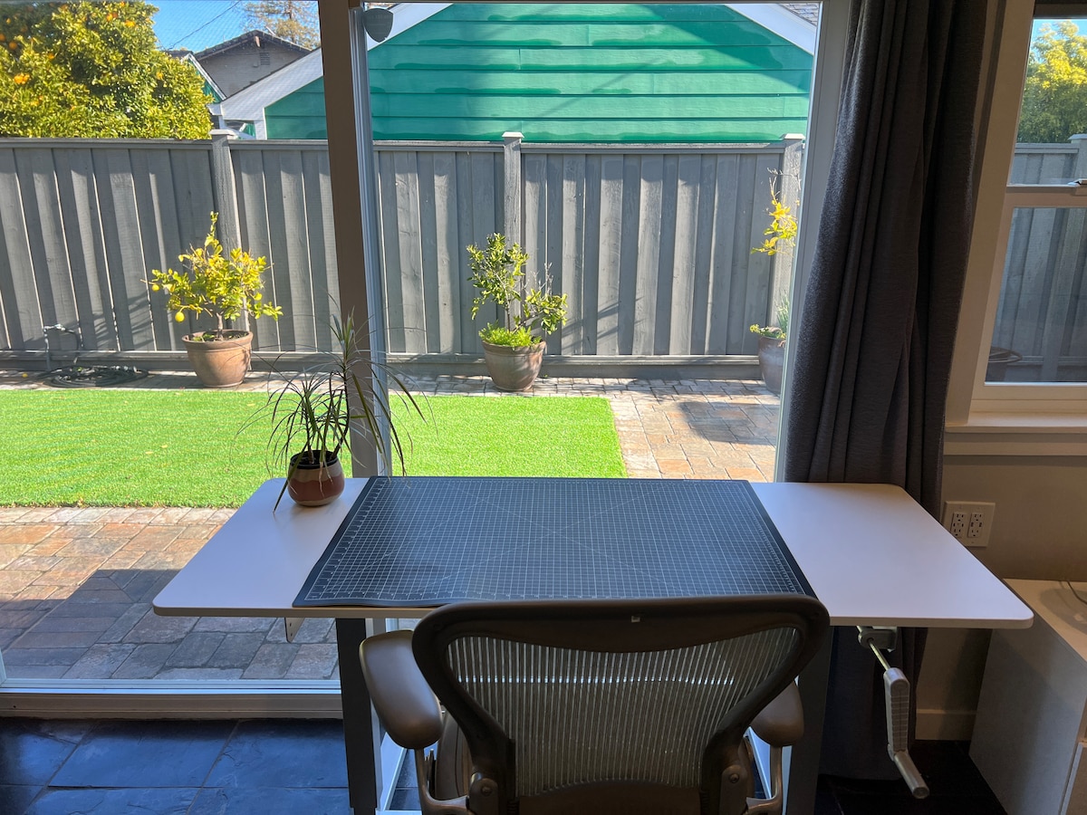 Recently painted, our quiet, safe, very clean and quaint Mediterranean style guesthouse, is located in a landscaped yard underneath a Redwood tree, and is suitable for only 1 guest. You can conveniently walk to Midtown neighborhood cafés, great eateries and markets. Quickly access the Stanford campus, Silicon Valley companies, San Antonio Shopping areas, and California Ave Caltrain Station by car. You're welcome to enjoy our backyard, nap in the hammock or work on the patio with WiFi access.