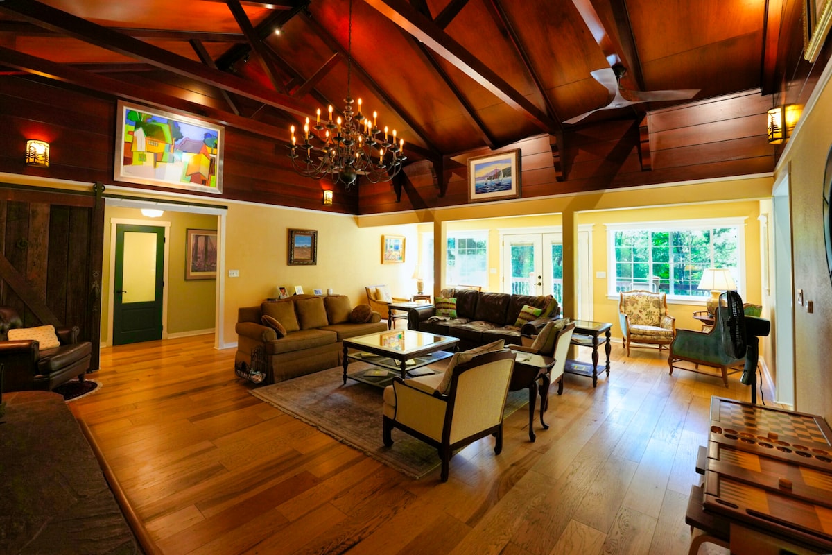 Stay in an upscale place that’s near everything you want to visit. This beautiful estate nestled within the Redwood trees, is a 10 min walk to downtown Boulder Creek restaurants and markets. The home has one of the most majestic fireplaces w/vaulted wooden ceilings in Santa Cruz County. Every room has its own private bath. Jacuzzi, tub, swimming pool, front porch, deck, and firepit area. Most recently, the estate served as a filming location for Season 3 of a popular series on Amazon Prime.