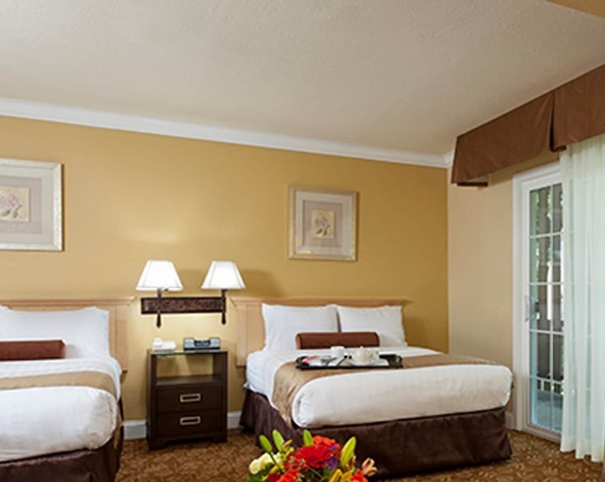 The 2 queen beds non-smoking room features two comfortable queen beds and modern contemporary decor, ideal for up to four adults. This service-animal friendly room includes air conditioning, heating, refrigerator, microwave, ironing board, desk, LCD/LED TV with cable, direct dial phone, alarm clock, hair dryer, coffee and tea maker, free high-speed wireless internet, and shower for a convenient stay.