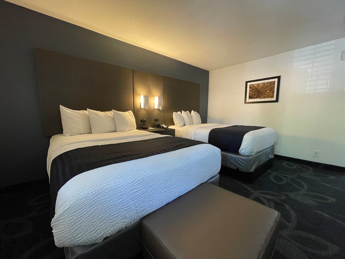 Our 2 Queen Bed Room comes with 2 comfortable Queen Beds making it idea for a group of up 4 adults. Each Room is service-animal friendly and consists of a Hair Dryer, Iron/Ironing Board, Coffee/Tea Maker, Free High-speed Wireless Internet, Microwave/Refrigerator and modern contemporary decor.