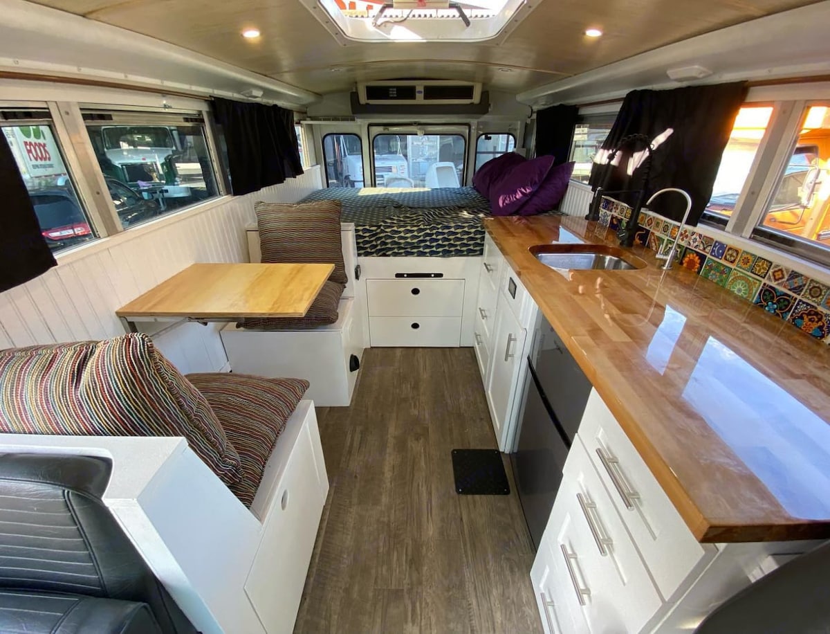 Beautiful converted skooli with a queen size Tempur-pedic mattress, electricity, water, full kitchen with mini fridge/freezer, toaster oven, electric stove, sink, and water filter. This will be your own private space, with access to a private bathroom in the main house. You are also welcome to relax in the patio area, or star-gaze on the roof deck of the bus!