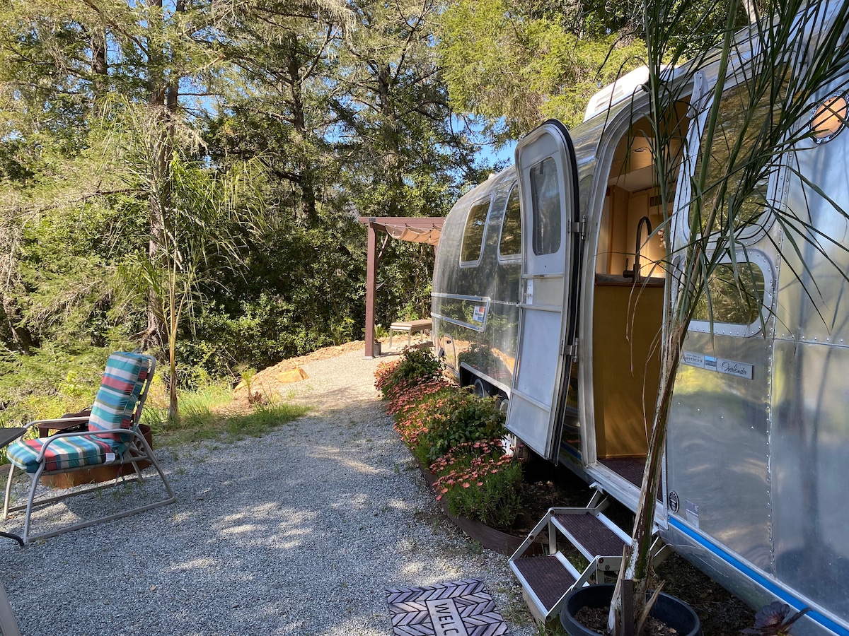 The Airstream @ the Hacienda is the perfect getaway for anyone who is looking for peace and tranquility. Built in 1977, this modest 32’ Airstream rests on a ridge top that over looks the San Lorenzo Valley. It is not uncommon to witness a Redtailed Hawk flying overhead or a small band of Squirrels rustling in the trees. The Hacienda is centrally located and only 5 minutes to Ben Lomond town center, 10 minutes to Henry Cowell State Park & only 20 minutes to Santa Cruz.