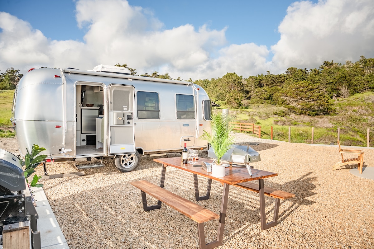 On 9 private acres overlooking the stunning Beach and Ocean from a breathtaking cliff top view. Stunning sunsets. Famous surf views with large windows. Fully loaded with all the amenities to make your glamping experience perfect. Fire pit, outside BBQ, outside griddle, Heat, A/C and fully stocked kitchen. Full bathroom with shower. Within 10 mins of Half Moon Bay shopping. Beach access short walk or drive. If this one is booked, there are three other equally similar Airstreams on the property.
