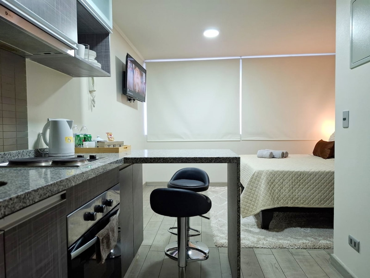 Our studio is designed to offer you the perfect balance between comfort and style. It features a double bed, a fully equipped kitchen, and a private bathroom. You’ll enjoy free Wi-Fi and a peaceful atmosphere that will make you feel at home. Immerse yourself in Chile’s rich history by visiting the Comic Park and the open-air museum, tributes to local pop culture, or relax at the Civic Plaza, where you can find live music and activities for the whole family.