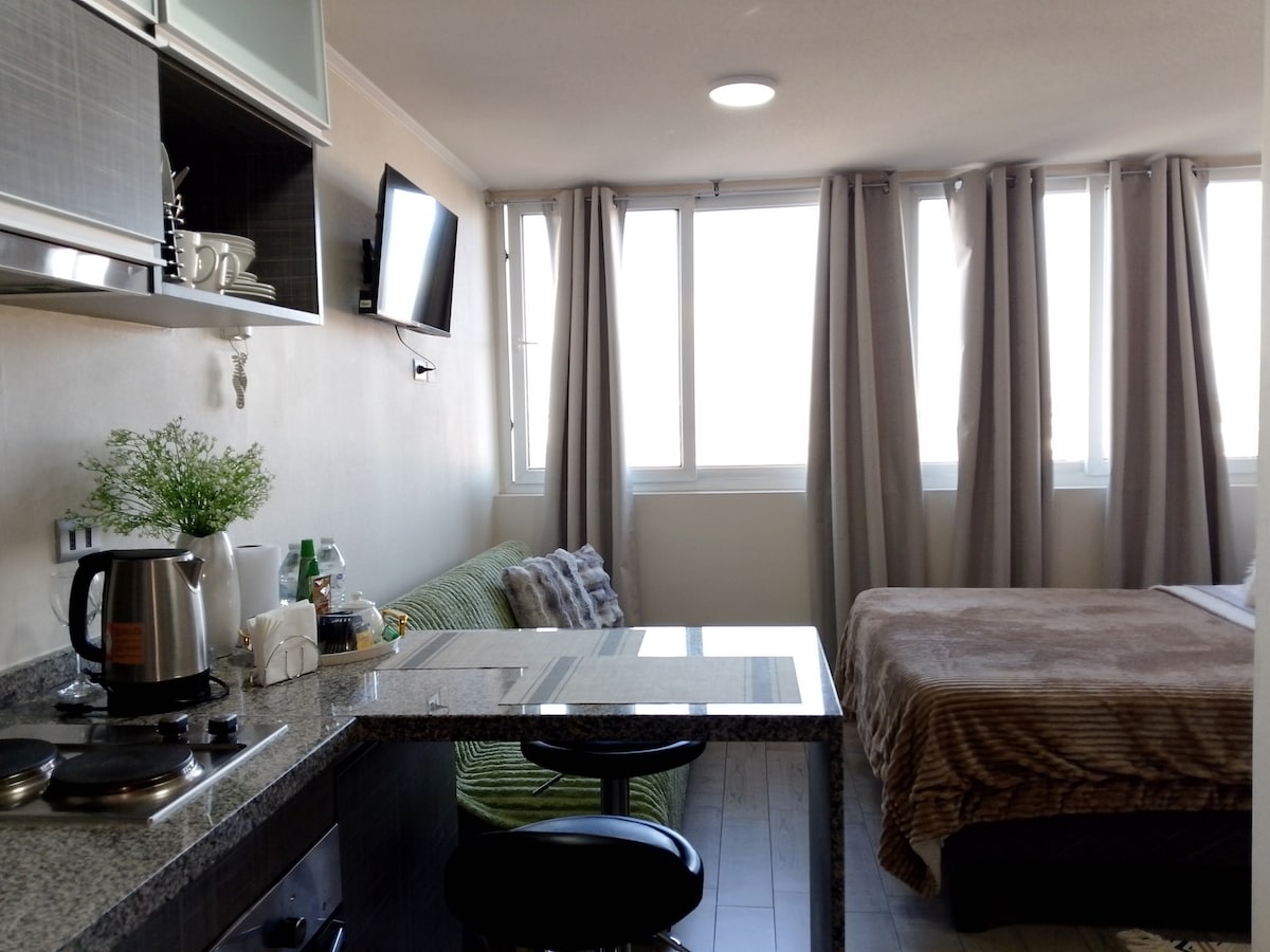 This apartment is ideal for relaxing and enjoying the city. It's centrally located, between the Santiago Centro and Providencia districts, one of the best locations in the city. It offers beautiful views of San Cristóbal Hill and the Sky Costanera. It's just a 3-minute walk from the metro and buses. Includes: Free Wi-Fi, a fully equipped kitchen, sheets and towels included, a large bed with a large Smart TV. Self-service entrance with a key, allowing you to arrive at any time.