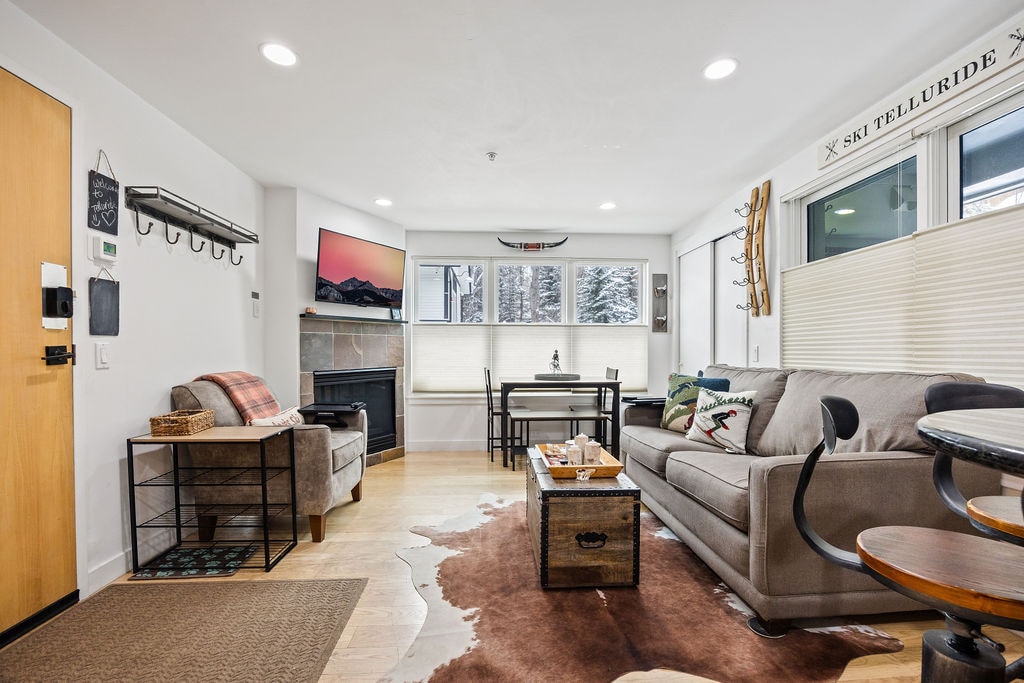 Discover the perfect blend of rustic charm and modern comfort at this bright 1-bedroom condo nestled in the picturesque Telluride Valley. Minutes from world-class skiing at Telluride Ski Resort, this mountain retreat is your ideal base for alpine adventures. Walk to the gondola or take the free shuttle for quick mountain access. After a day of excitement, relax on your private patio, cozy up by the gas fireplace, or unwind in the outdoor heated pool and hot tubs.