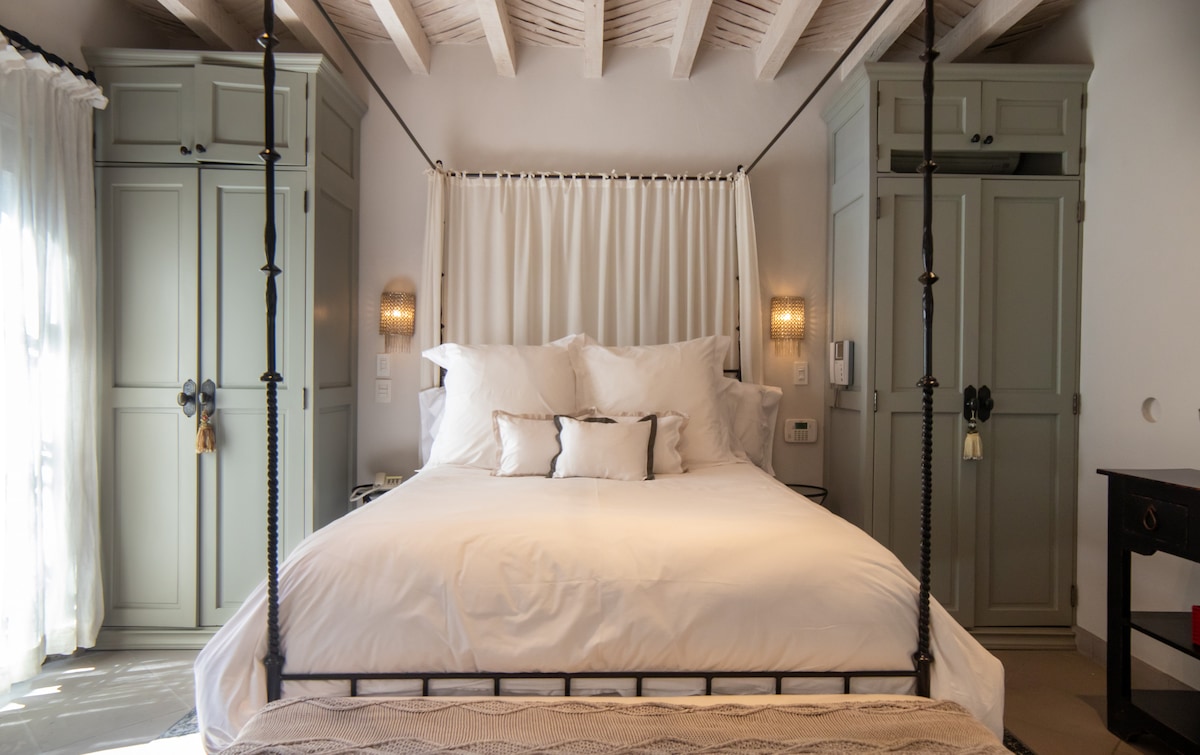 Two-story, two-bedroom, fully furnished elegant residence of 2,370 sq-ft include 2.5 baths, walk-in closet, a fully equipped kitchen, an outdoor private terrace overlooking interior gardens, among others features. For the master bedroom, the architects designed a gorgeous Catalan vault to add space and character to the room that connects to a large outdoor terrace with impressive views of the Parish Church of San Miguel Arcángel. The ceiling bleached beams balance the room with visual warmth.