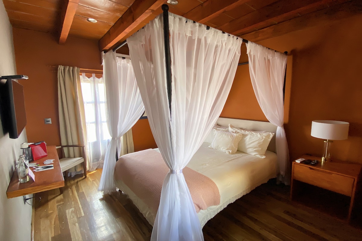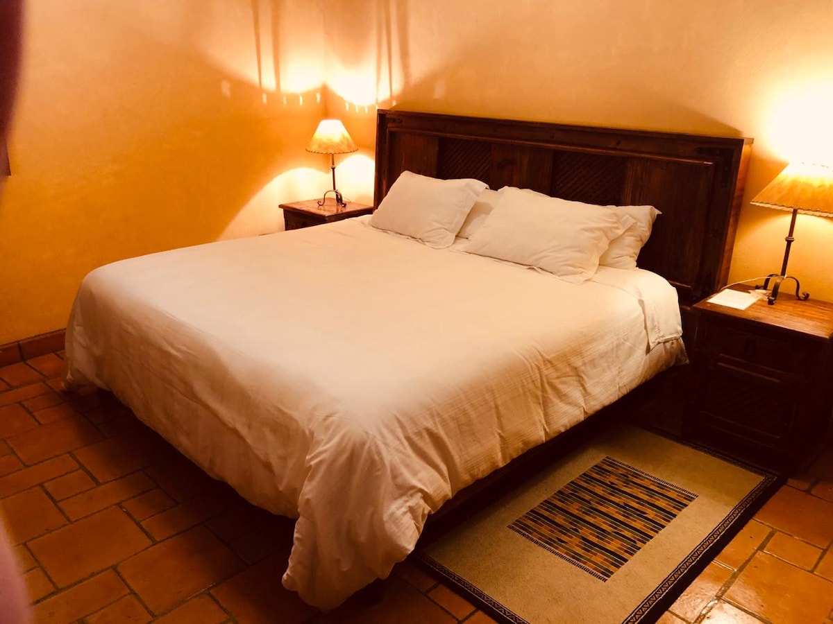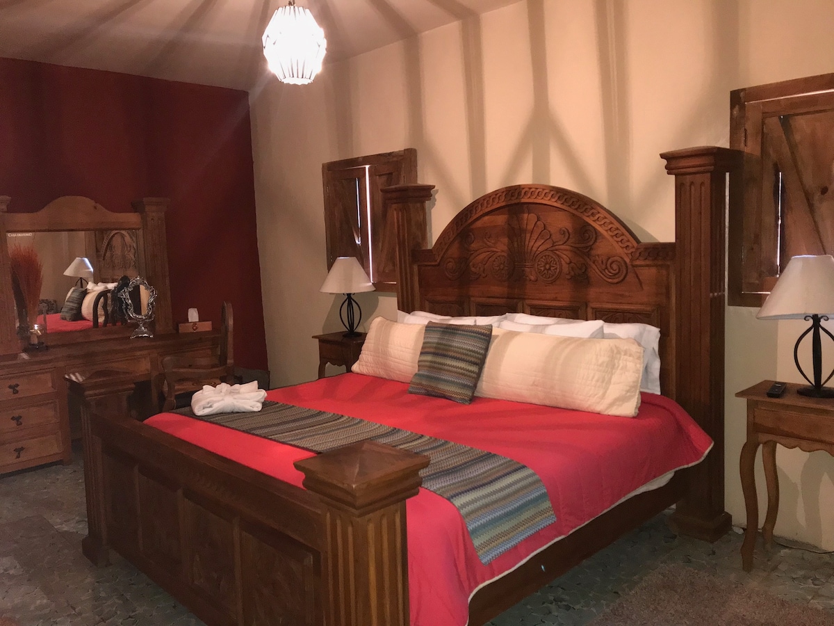 Máster Suite con una cama King Size, decoración especial, cada cuarto es diferente. Tiene acceso a la terraza y vista a la Parroquia. Incluye todas las amenidades además cuenta con una cocineta, aire acondicionado y chimenea. Capacidad para 2 personas. Master suite with King size bed, terrace view to the Parroquia. Includes all luxury amenities, A. C. and kitchenette. Maximum capacity for 2 persons.