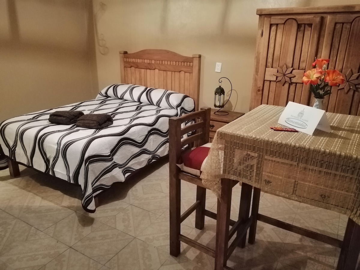 One bedroom adobe house with a kitchen, bathroom, living room with a sofá, chimeny, and a private terrace. Our guest can use common areas as a palapa, a big kitchen and an outdoor dining table. On the same property are other 2 buildings with one bedroom and a private bathroom. There are a lot of space for walk, read or do yoga.