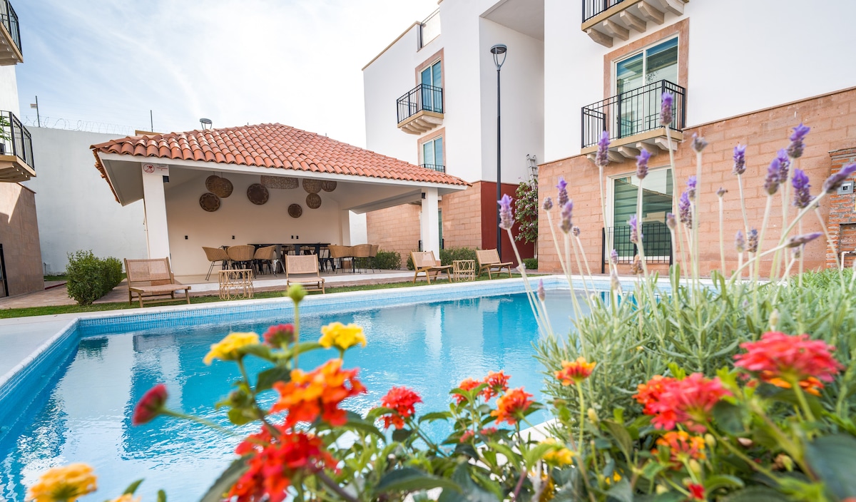 Muy cerca de el centro, Apartamento de dos recamaras, dos baños, amueblado, Alberca, lavadora, secadora, Roof Top y balcones, con vista a las iglesias, seguridad 24 horas, un parqueo disponible adentro de las instalaciones, todo lo que necesitas lo tenemos para que disfrutes de la tranquilidad de San Miguel de Allende. Se aceptan mascotas con un costo adicional. este alojamiento céntrico todo el grupo podrá tener fácil acceso a todo.