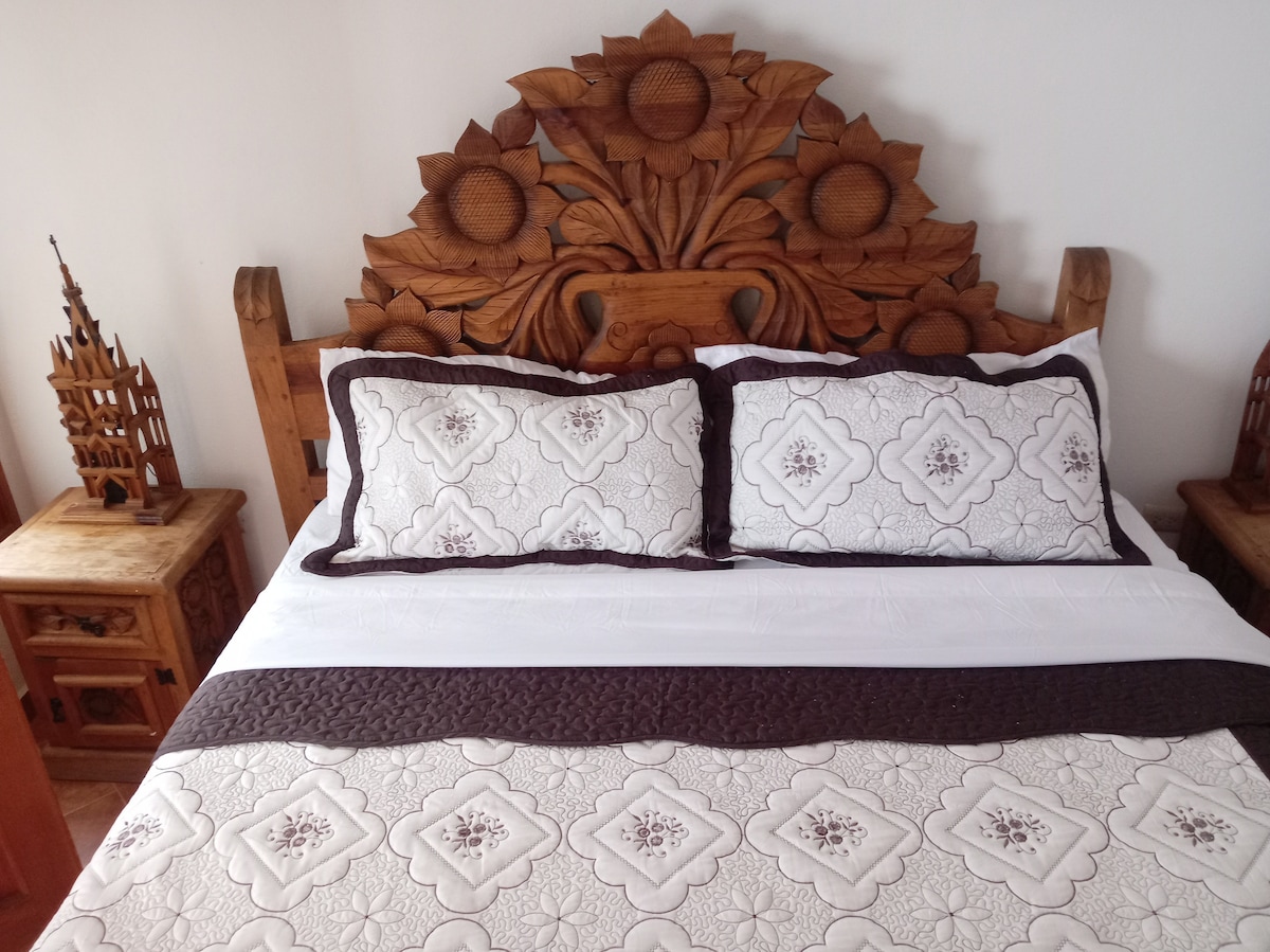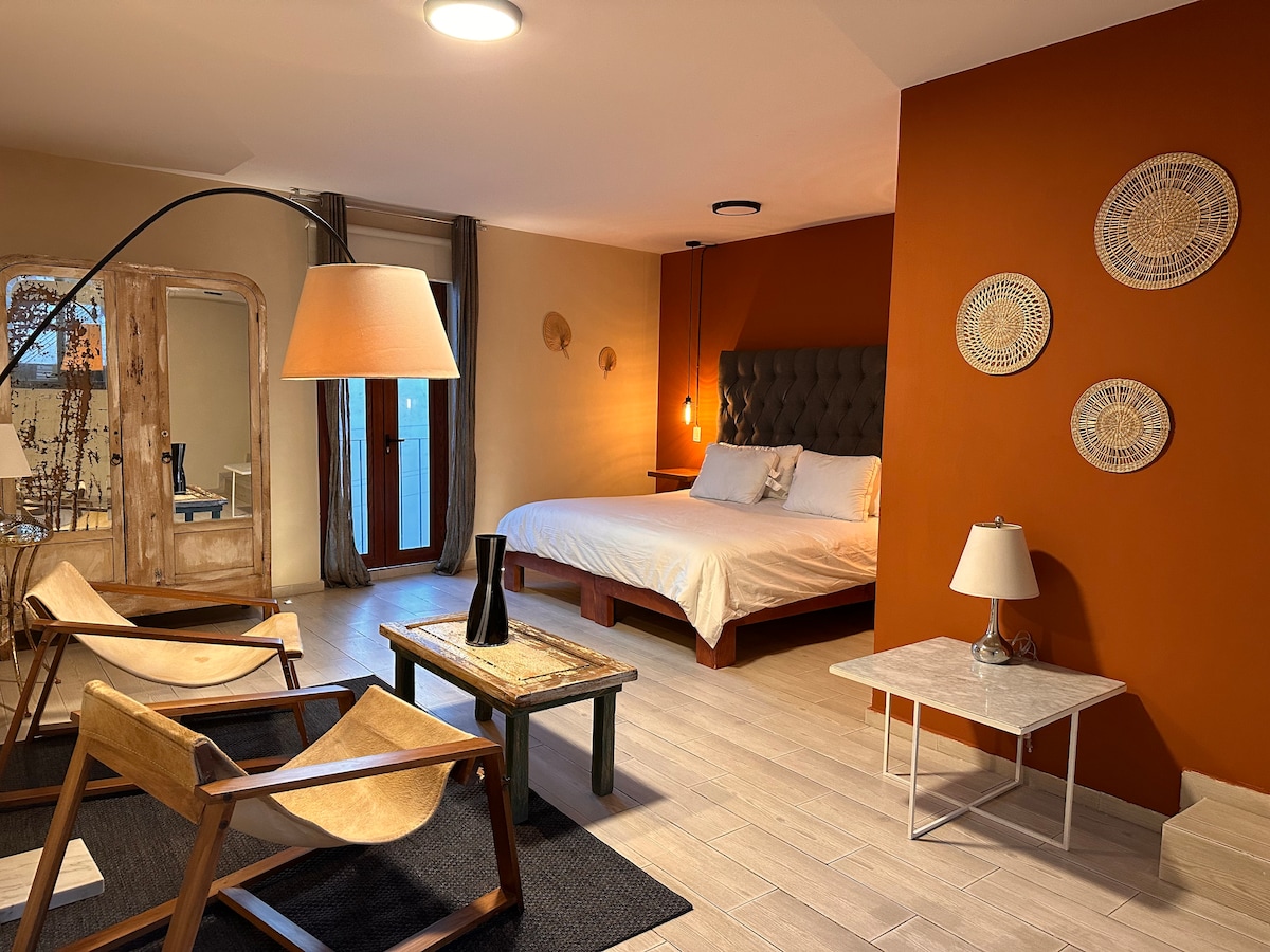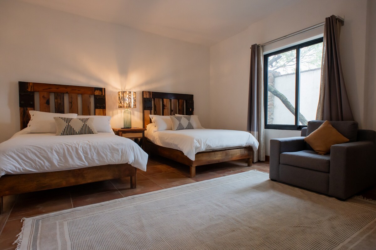 La Habitación “Rosa” ofrece un ambiente romántico y encantador, con cama king y un baño privado. Sus paredes en tono rosado y el mobiliario rústico-mexicano generan una atmósfera cálida y acogedora, perfecta para parejas o viajeros que buscan un espacio íntimo y cómodo.