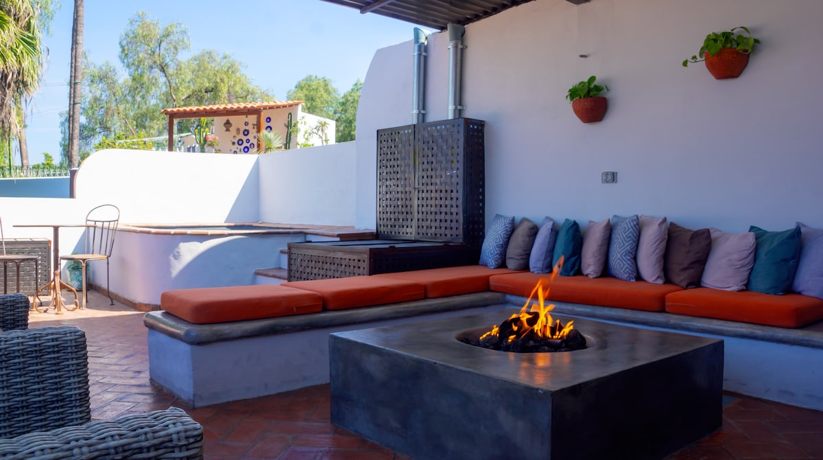 La Casita Boheme Paloma is a beautiful little rustic casita in the Center of San Miguel de Allende in a colorful, cute local area in Colonia Azteca. We are a 5-7 minute walk downhill to the Mercado de Artesanías and a 10 minute walk to the Jardín + center of SMA. Casita Paloma is off a unique callejón, walk street, so there won’t be noise from cars or horns. We renovated and designed our Casita with lots of love, design touches + artisan made products throughout. 1 king + 1 queen for comfort