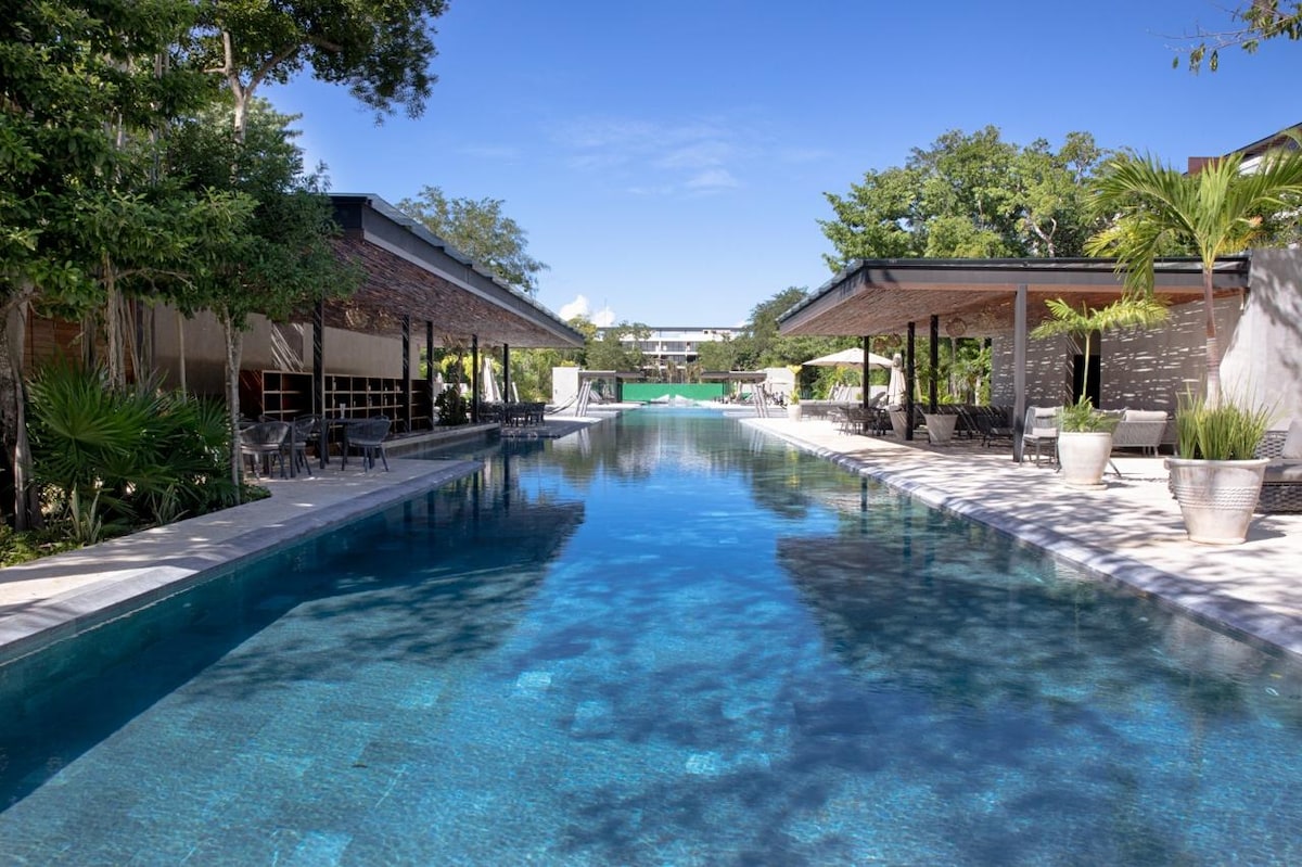 Hola!! somos "HAPPY RENTALS RIVIERA MAYA" Disfruta de este amplio y moderno departamento en un residencial exclusivo dentro de una comunidad cerrada, ideal para 5 personas. Rodeado de áreas verdes, una terraza privada y una vista que te alegrará todos los días! Con amenidades tipo resort, ideales para todos los gustos desde familias con niños, parejas y áreas exclusivas para adultos. Una perfecta combinación en el Caribe entre lujo y naturaleza, este departamento es ideal para ti!