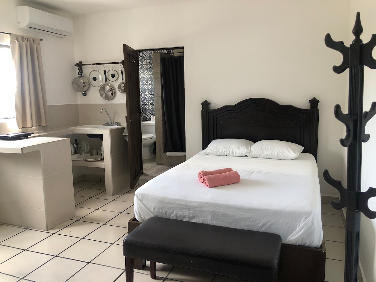 Ubicada en el corazón de Cozumel, ésta acogedora casa de huéspedes se encuentra rodeada de restaurantes locales, tiendas y supermercados. Donde podras vivir una experiencia local, pero a la vez cerca del area turística. Localizada en la avenida principal de Cozumel, a solo 7 cuadras del ferry y 5 minutos del aeropuerto internacional de Cozumel. Tenemos 2 habitaciones de este tipo, puedes hacernos saber tu favorita, sin embargo la asignación será sujeta a la disponibilidad del día de tu llegada