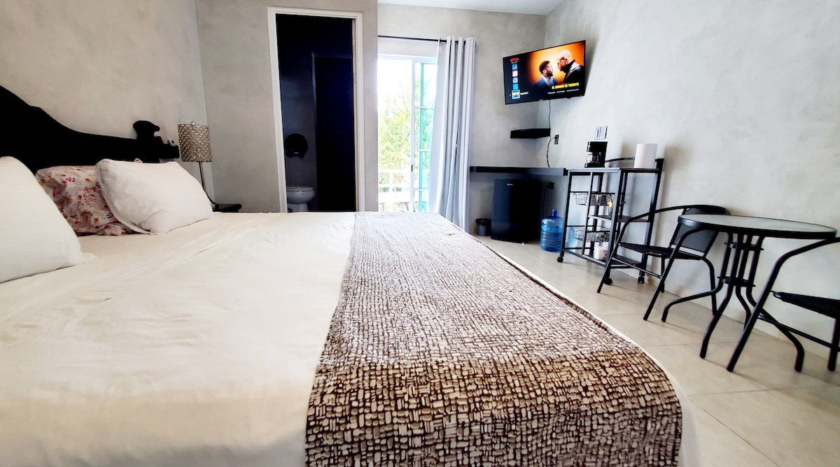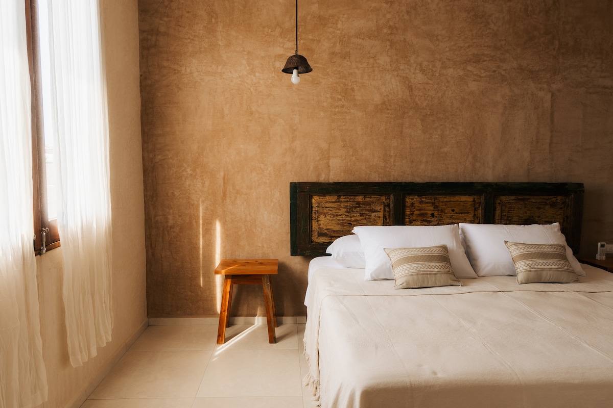 Amplia habitación King size en el hotel Izkina que se encuentra en el corazón de cozumel. Deja que la magia te atrape.